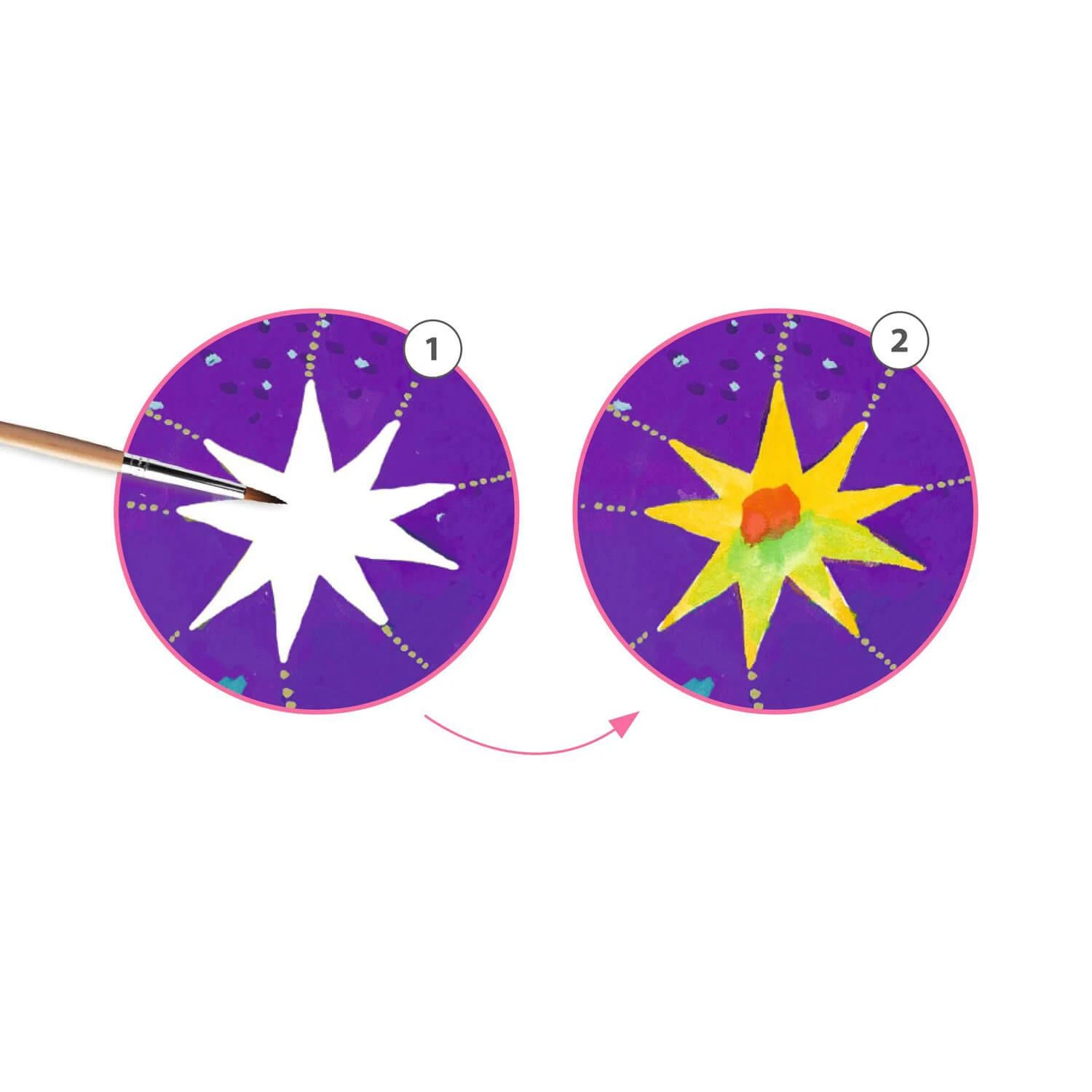 Contenu : 8 cartes illustrées (20 x 20 cm – 4 modèles x 2), 1 palette de gouaches de 8 couleurs, 1 pinceau, 1 livret d’explications pas à pas en couleurs.
