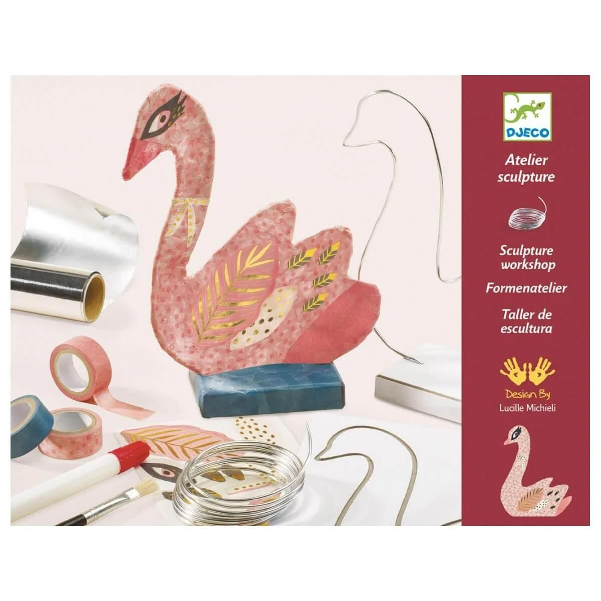 Un coffret pour s’initier à l’art de la sculpture en réalisant un cygne tel un véritable maître ! Guidé par le gabarit de carton, l’enfant forme les contours de l’animal avec du fil métallique qu’il positionne ensuite sur le piédestal prévu à cet effet. Pour donner du corps à cette structure, il superpose des languettes de papier aluminium qu’il recouvre ensuite d’un adhésif imprimé. Une fois les derniers stickers positionnés, il modèle son animal pour lui donner l’attitude souhaitée et le vernit pour le protéger. Chaque objet est unique, il n’y a plus qu’à l’exposer. Quelle fierté pour l’enfant d’avoir réalisé une sculpture de A à Z. La liberté offerte dans cette réalisation fait de chaque création un objet unique !