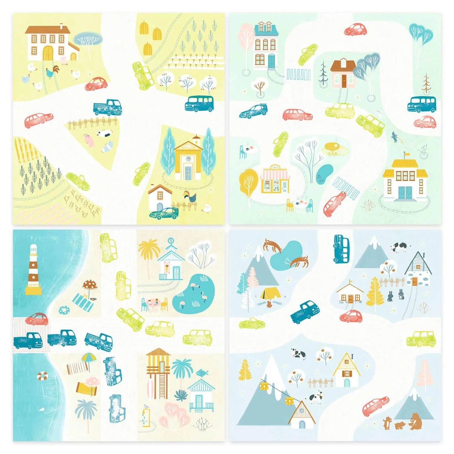 Un coffret de tampons sur le thème des véhicules où l’enfant décore librement les cartes aux douces illustrations.