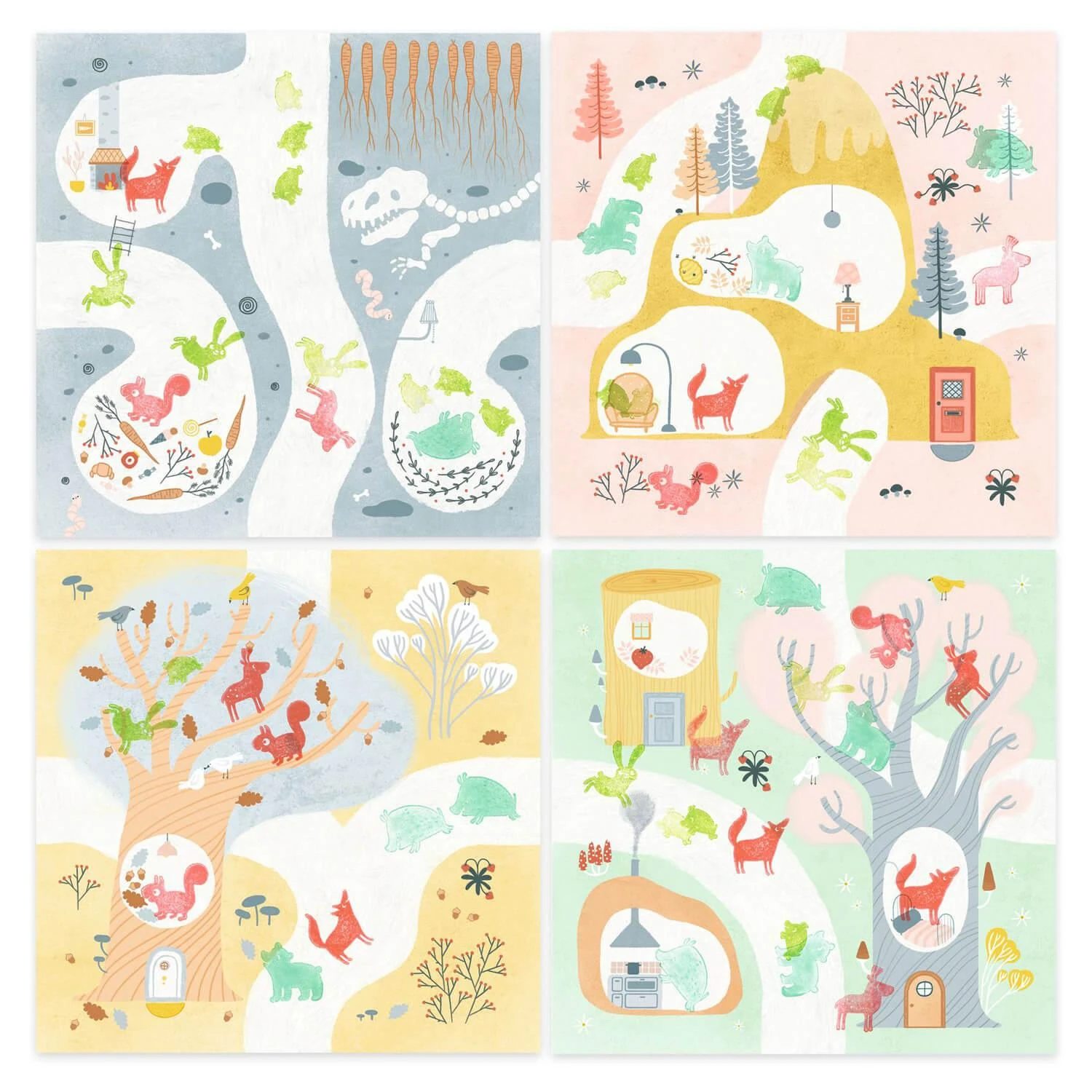 Progressivement, il encre les tampons et marque les empreintes pour animer les décors en laissant libre cours à son imagination. Les cartes s’assemblent pour créer de fabuleux parcours !