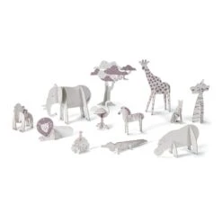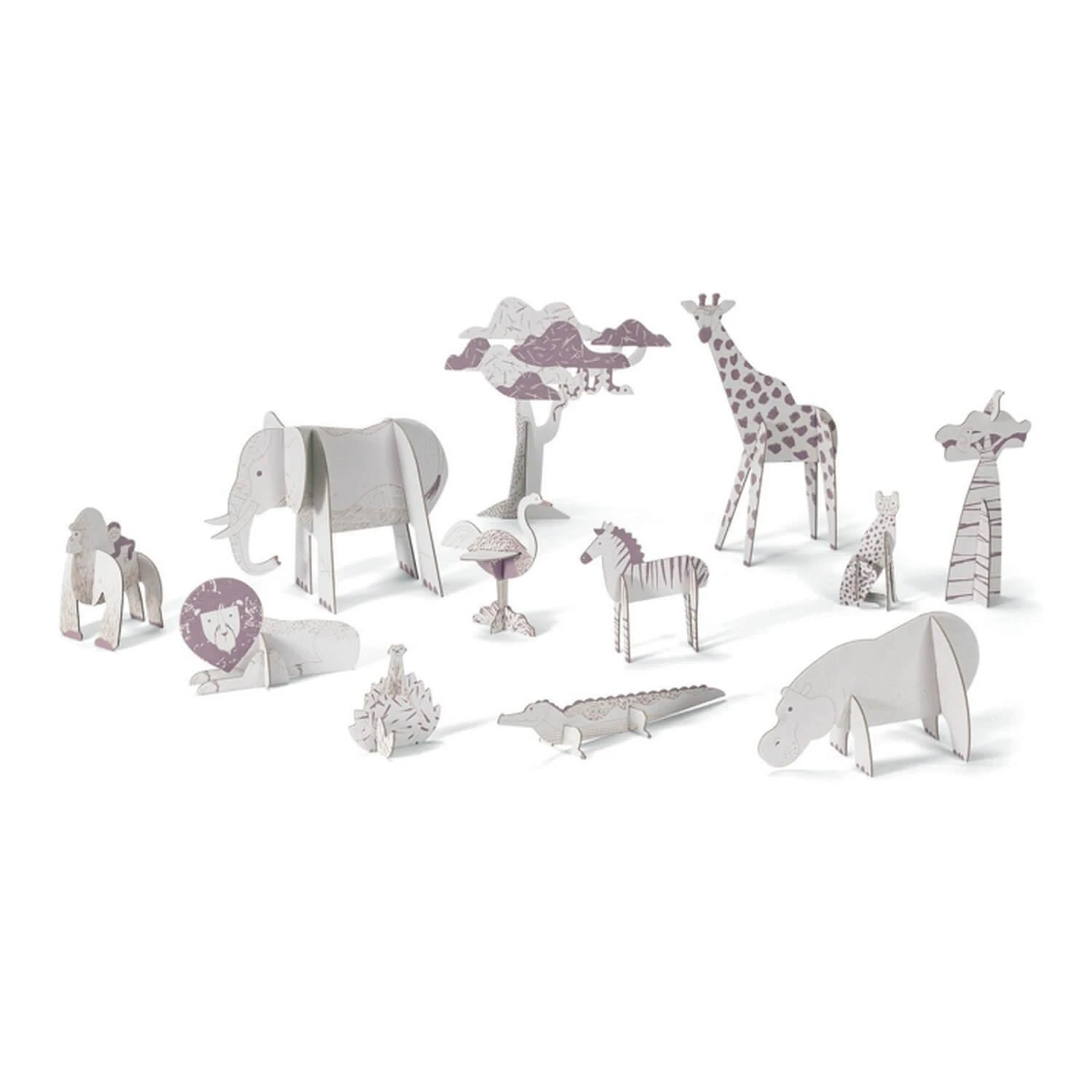 Ce kit contient une multitude de pièces en carton à colorier et à assembler pour réaliser des animaux et éléments de décors sur le thème de la savane.