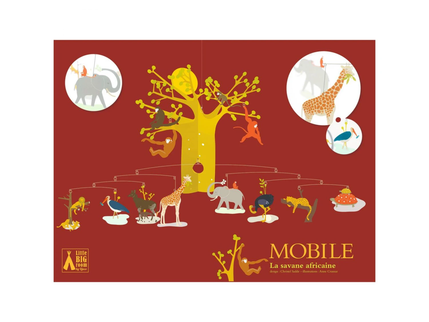 Un grand mobile très léger pour admirer les animaux de la savane graviter autour du baobab géant. La collection Djeco Mobiles, une rencontre poétique et aérienne entre deux mondes, le design et l’illustration. Un subtil jeu d’équilibre entre rêve et réalité.
