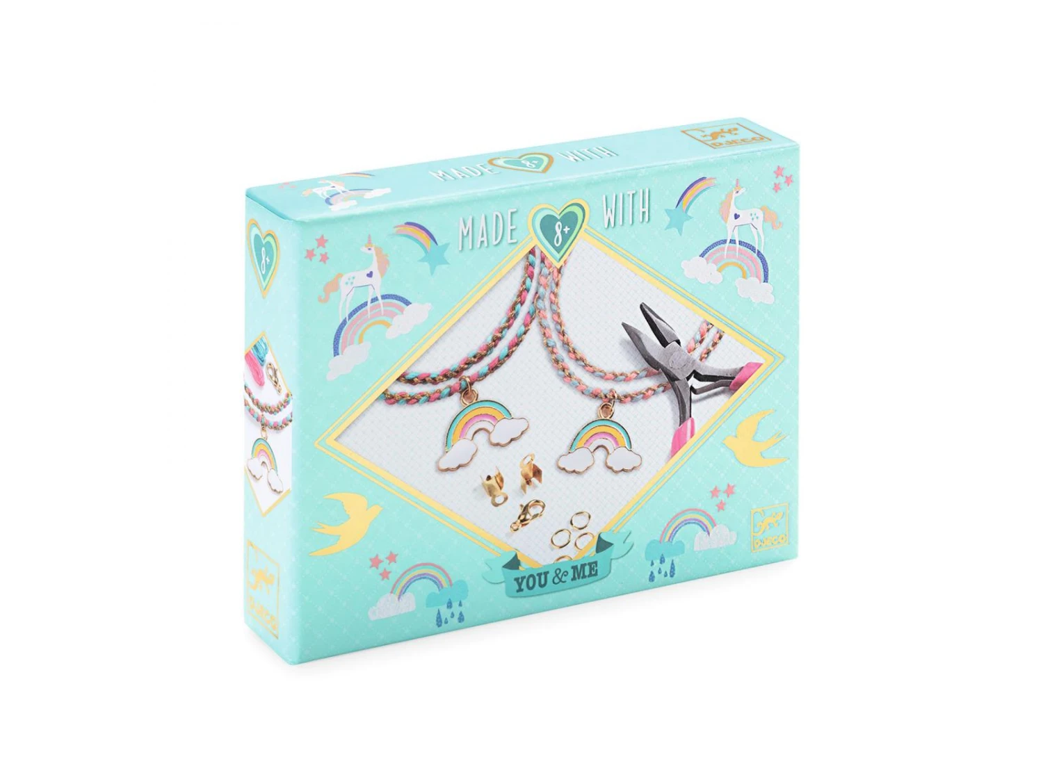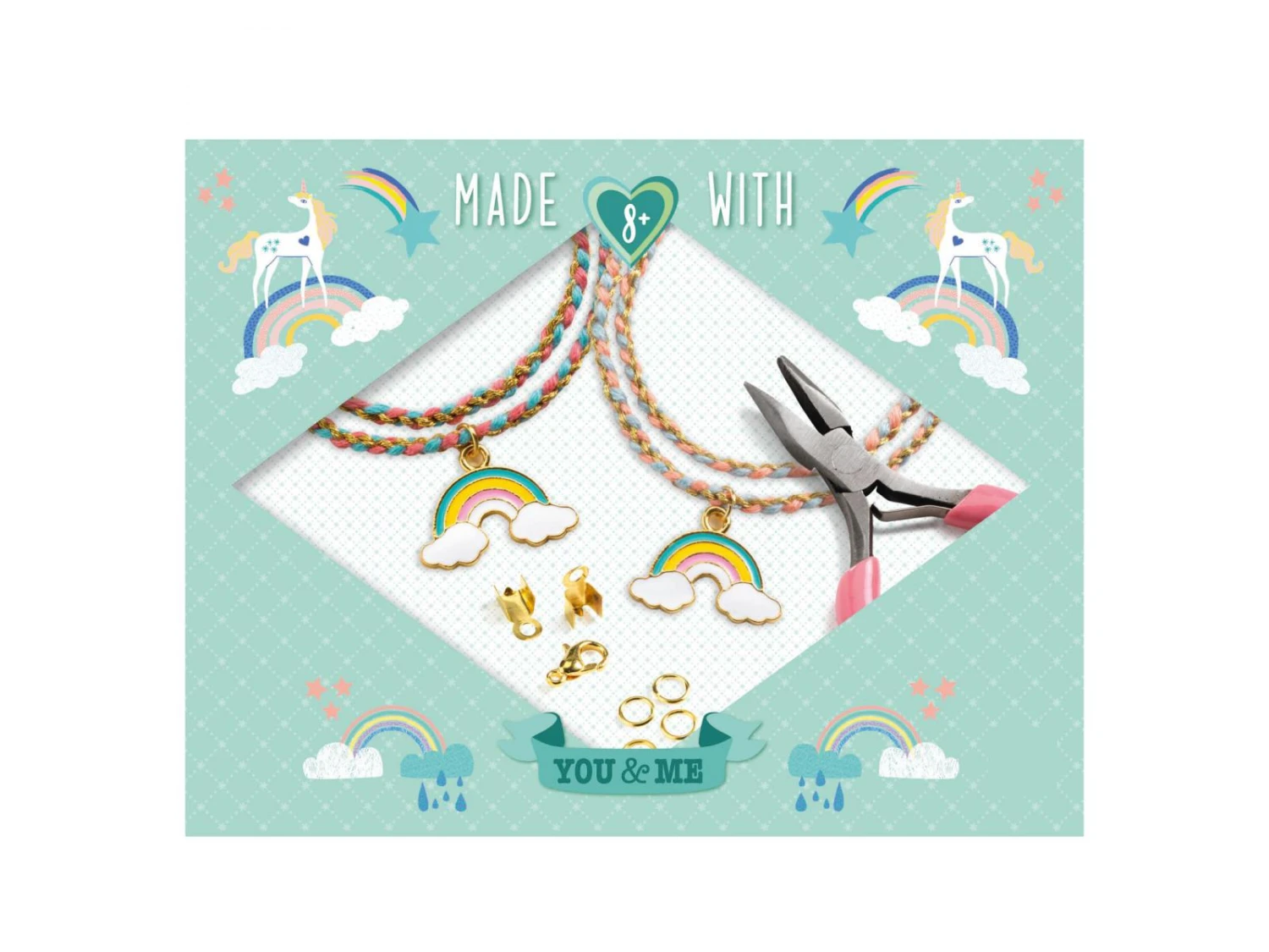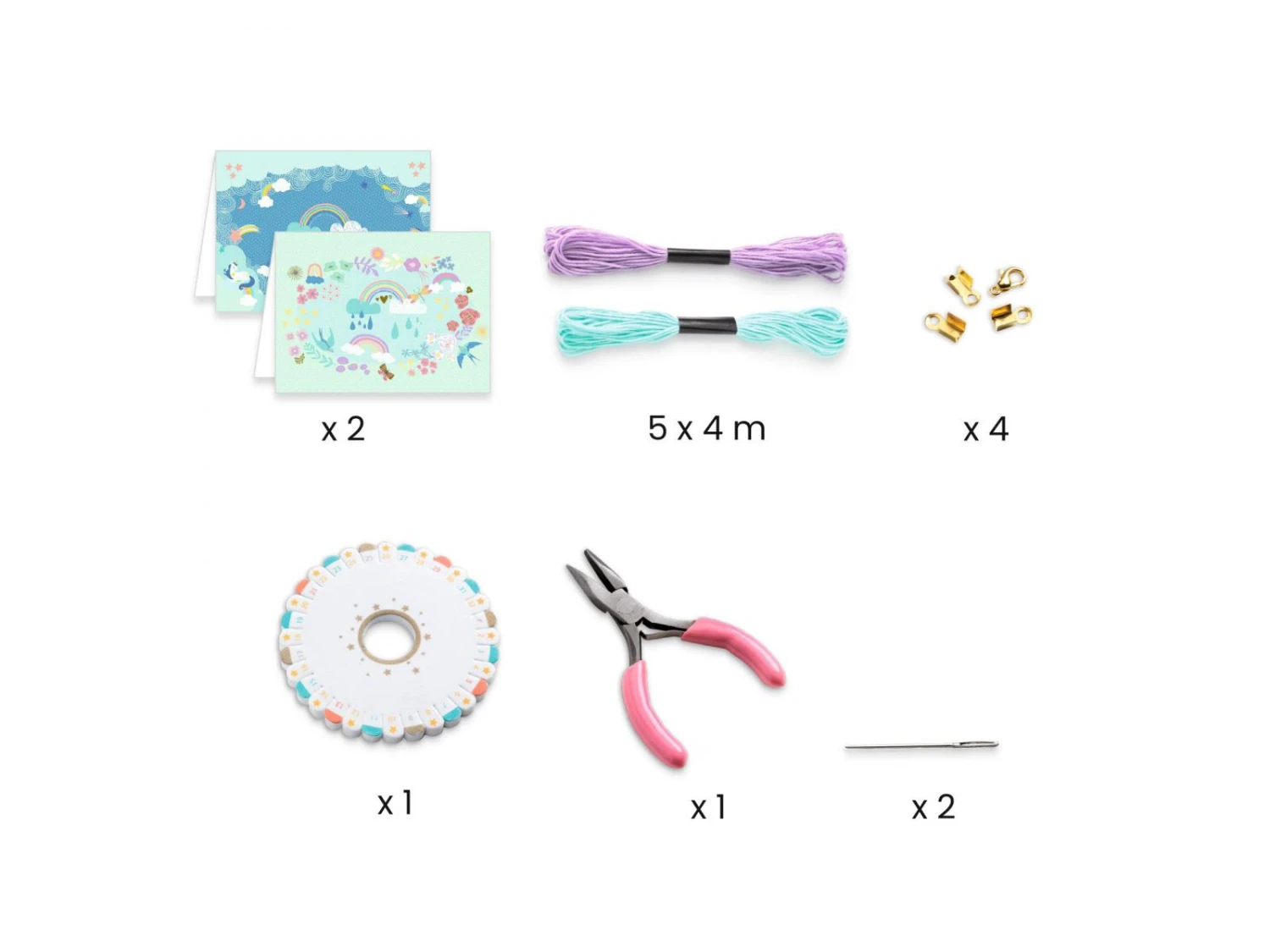 Dans une jolie boite brillante, tout le matériel inclus pour tressez 2 jolis bracelets arc-en-ciel selon l’art traditionnel japonais du kumihimo. Deux bijoux à conserver ou à offrir dans un joli sac en organza. Et pour encore plus de souvenirs, deux cartes illustrées sont incluses pour inscrire des mots doux.