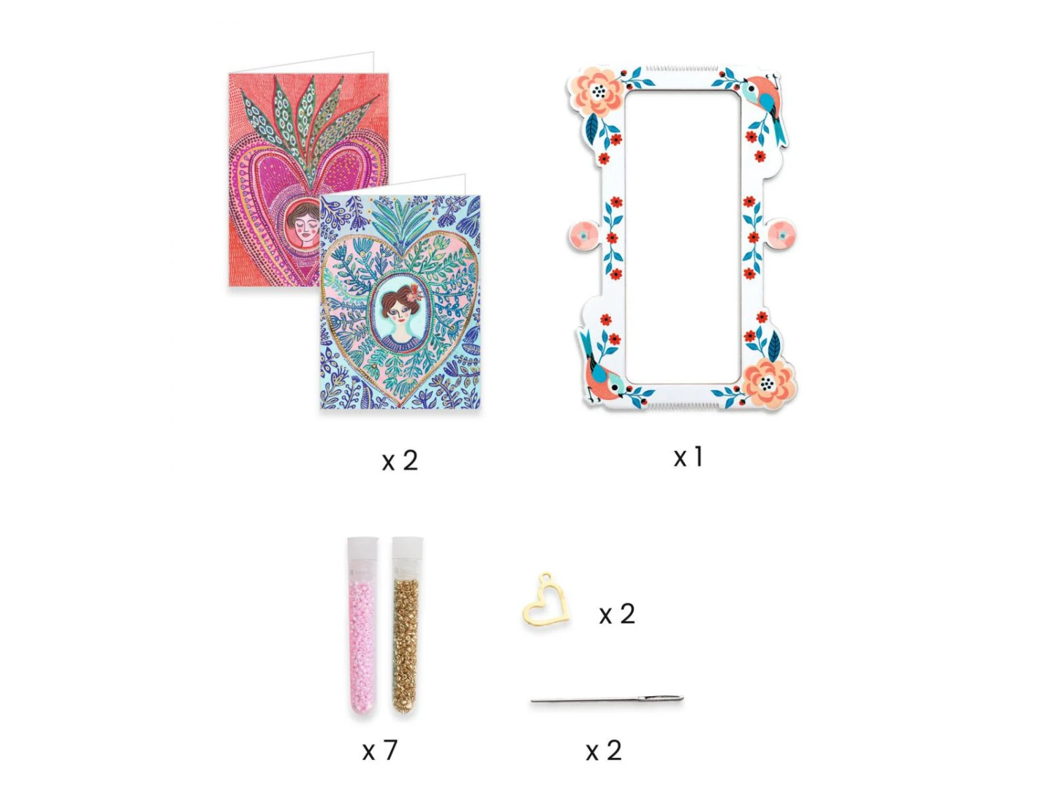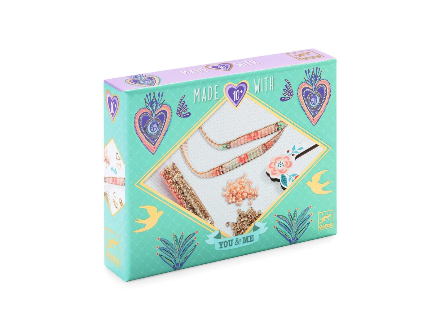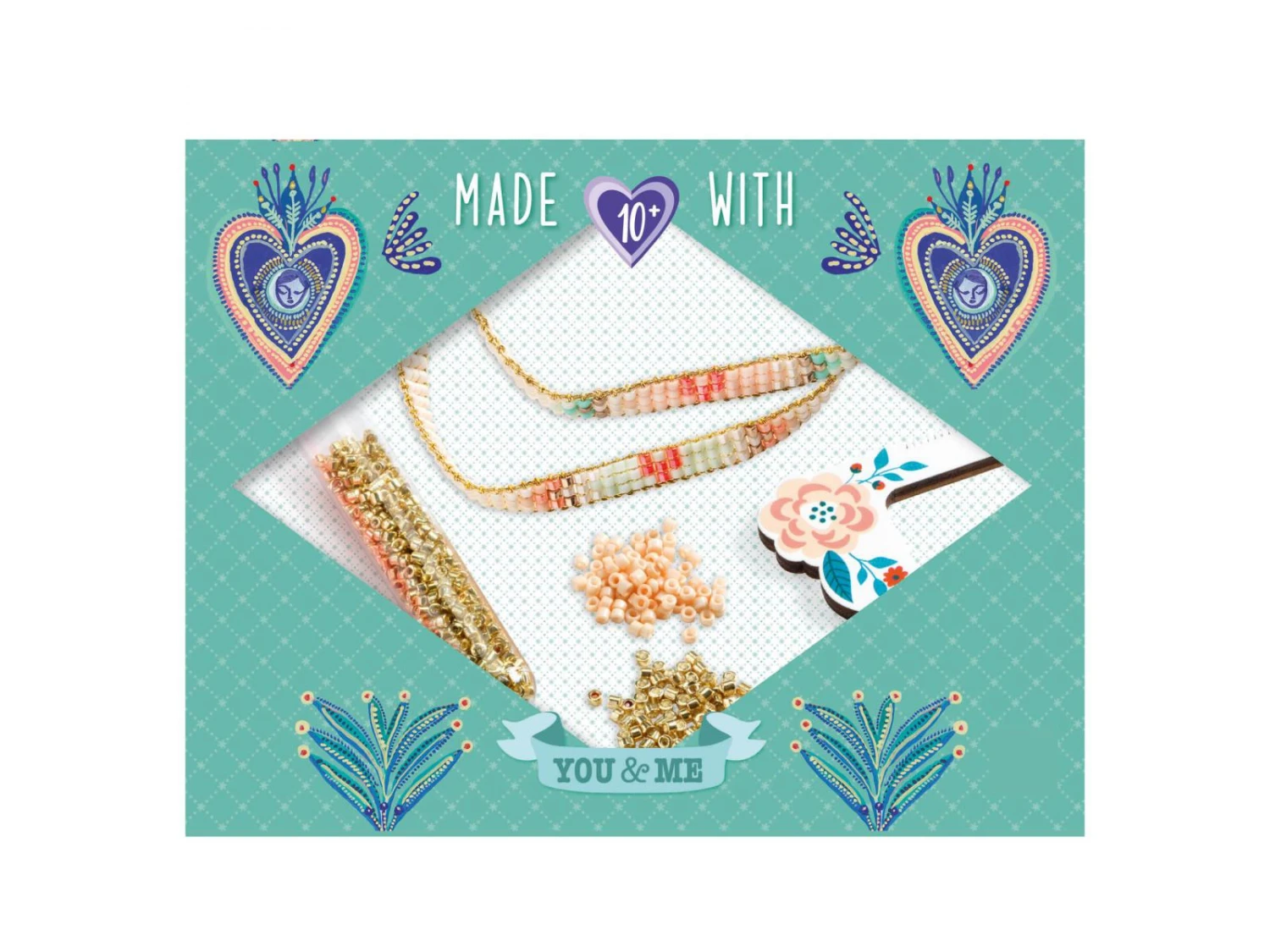 Dans une jolie boite brillante, tout le matériel inclu pour réaliser deux jolis bracelets à l’aide d’un métier à tisser ! En suivant les étapes et les modèles du livret, l’enfant tisse les petites perles colorées sur le métier à tisser. Deux bijoux à conserver ou à offrir dans un joli sac en organza. Et pour encore plus de souvenirs, deux cartes illustrées sont incluses pour inscrire des mots doux.