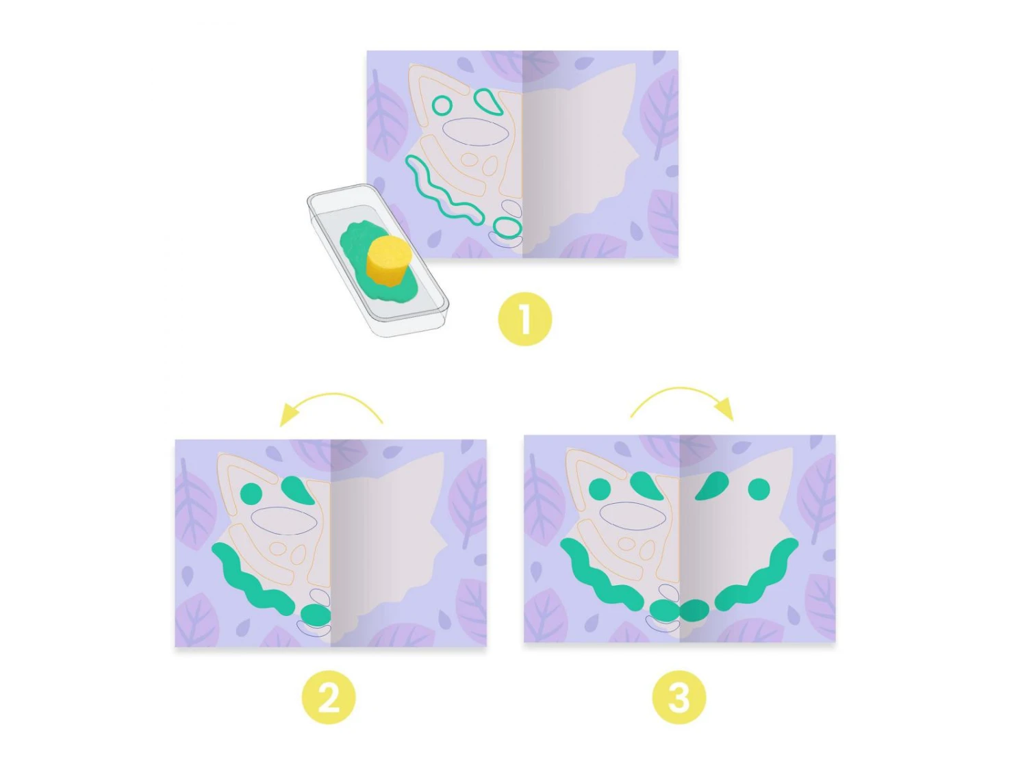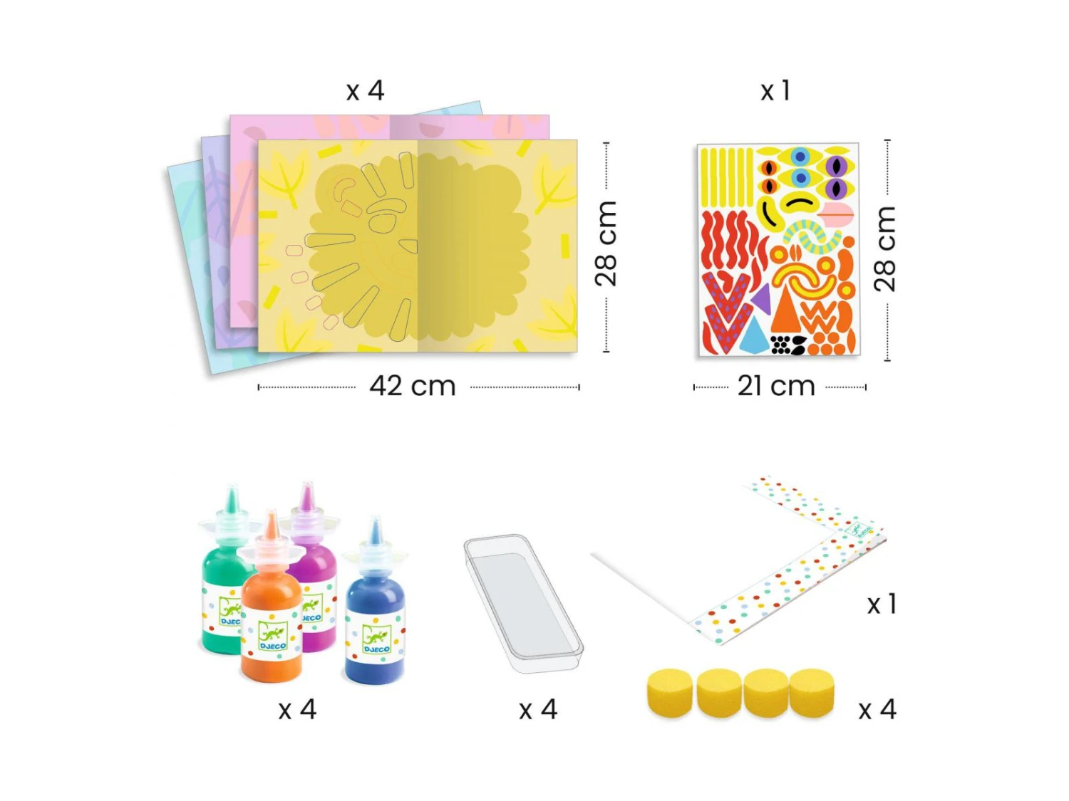 Un coffret de peinture pour révéler et mettre en couleur 4 grands animaux. Après avoir protégé la table avec la nappe, l’enfant dépose la peinture d’un côté, puis il replie la feuille. Il appuie et lorsqu’il ouvre la feuille : surprise, l’animal entier apparaît tout en en peinture ! Une fois la peinture sèche, il décore ensuite sa feuille avec les stickers.