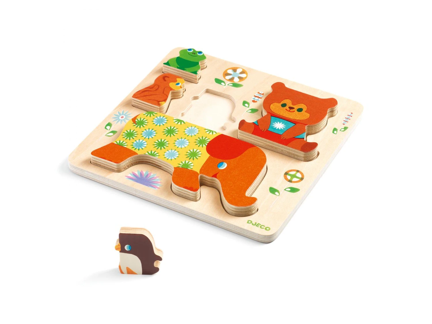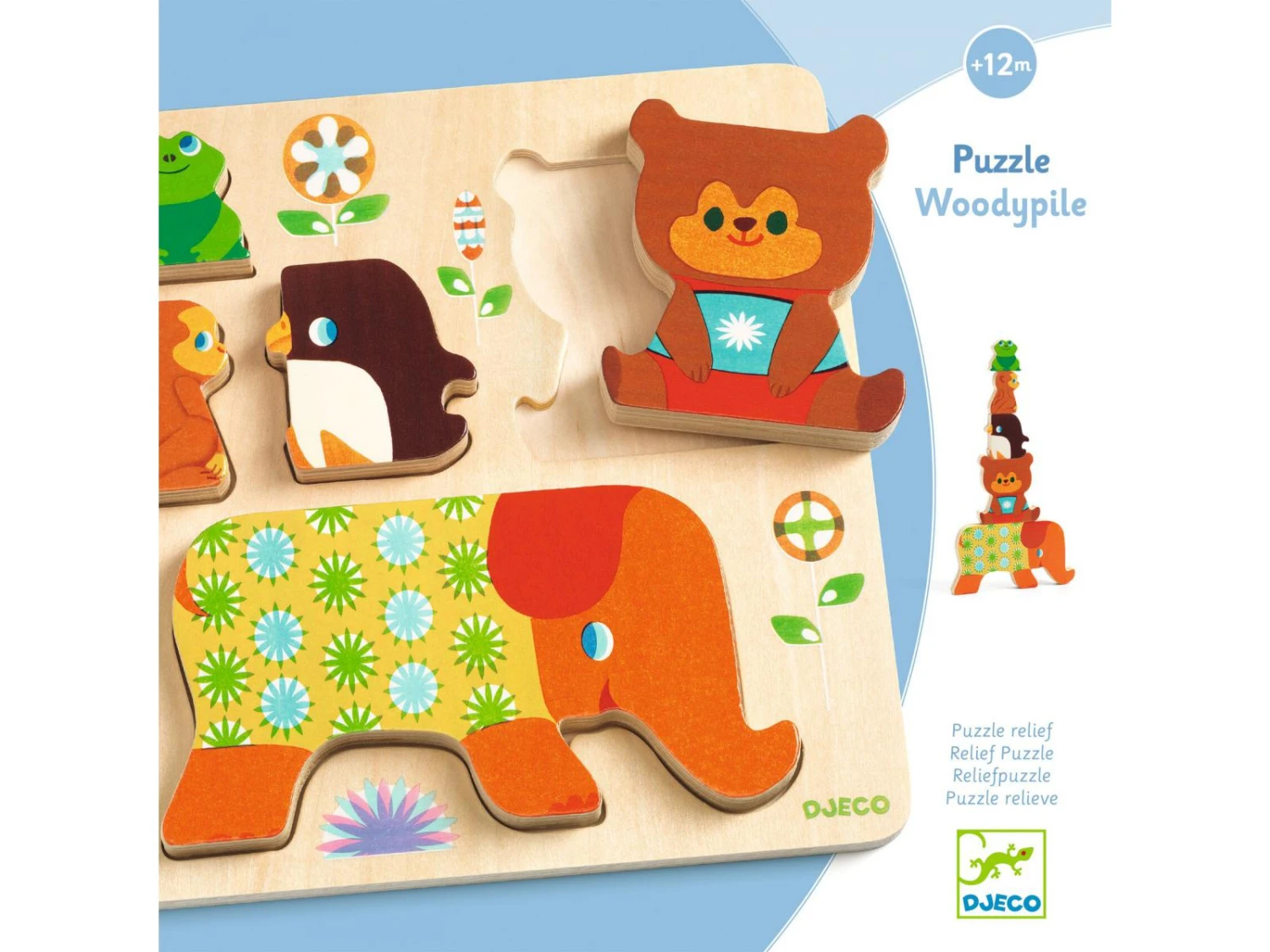 WoodyPile est un puzzle en bois facile Ă assembler. Les animaux en relief tiennent debout et peuvent se poser les uns sur les autres pour former une pyramide.