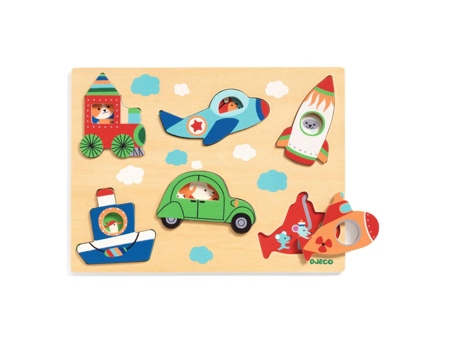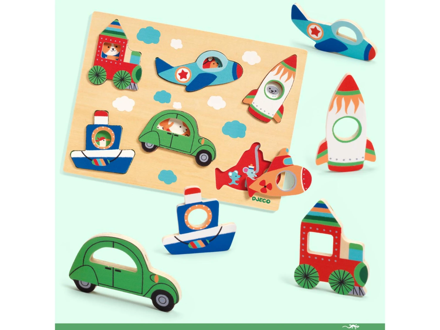 Coucou-vroum est un puzzle en bois sur le thème des véhicules. Sous chacune des pièces en forme de véhicule se trouve une illustration de personnages. En enlevant une pièce, l’enfant découvre qui conduit le véhicule.