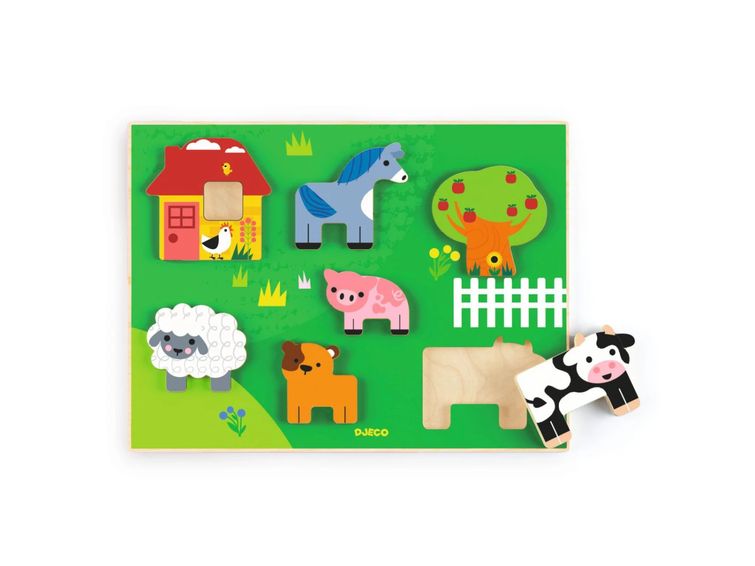 Farm Story est un puzzle en bois sur le thème de la ferme. Les pièces épaisses tiennent debout et permettent à l’enfant de s’amuser avec les animaux et le décor.