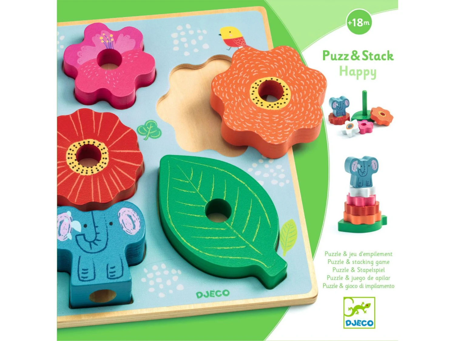 Puzz & Stack est un puzzle en bois facile à assembler et un jeu d’empilage. Les fleurs s’empilent sur l’axe en bois pour former une jolie pyramide de fleurs avec un petit éléphant sur le dessus.