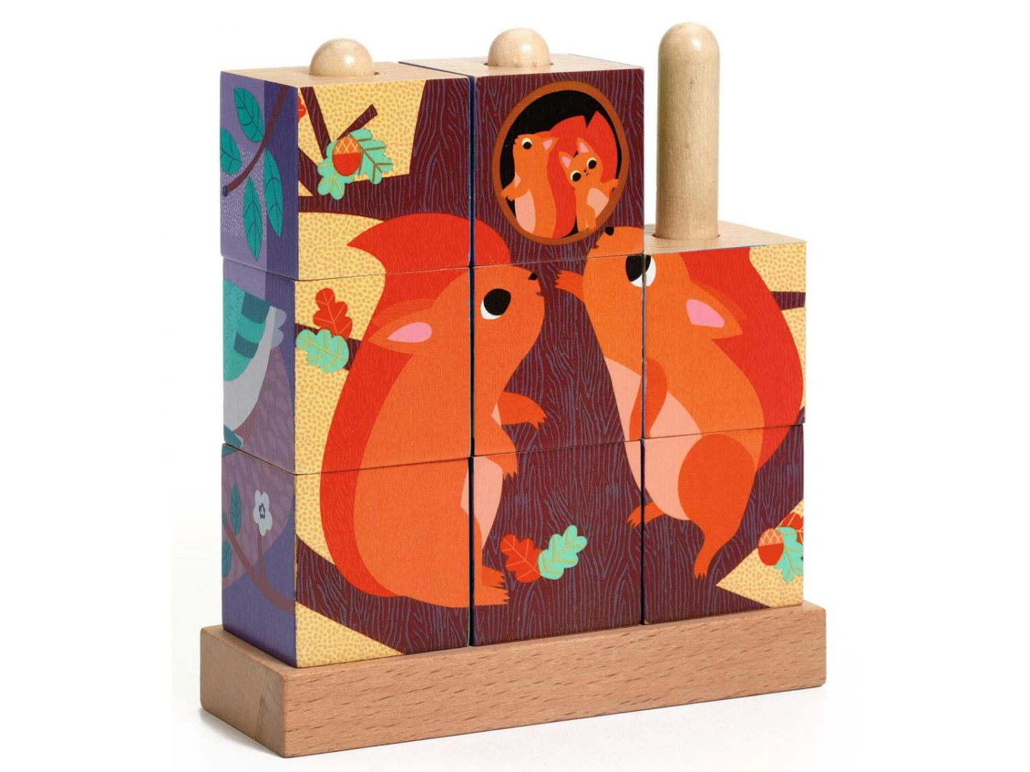 4 puzzles sur le thème des animaux de la forêt. Les 9 cubes en bois s’enfilent sur 3 tiges verticales pour aider l’enfant à les placer correctement.