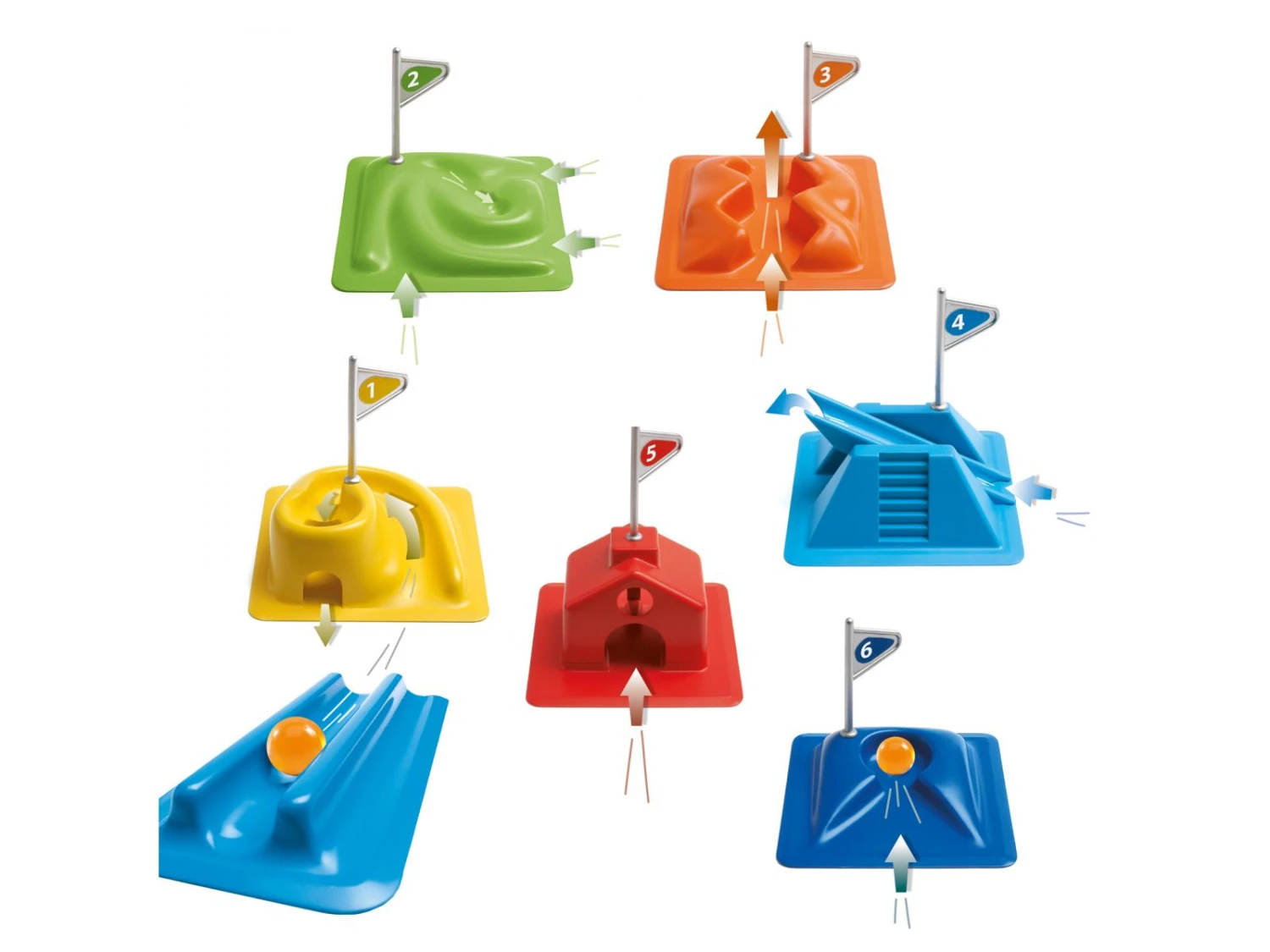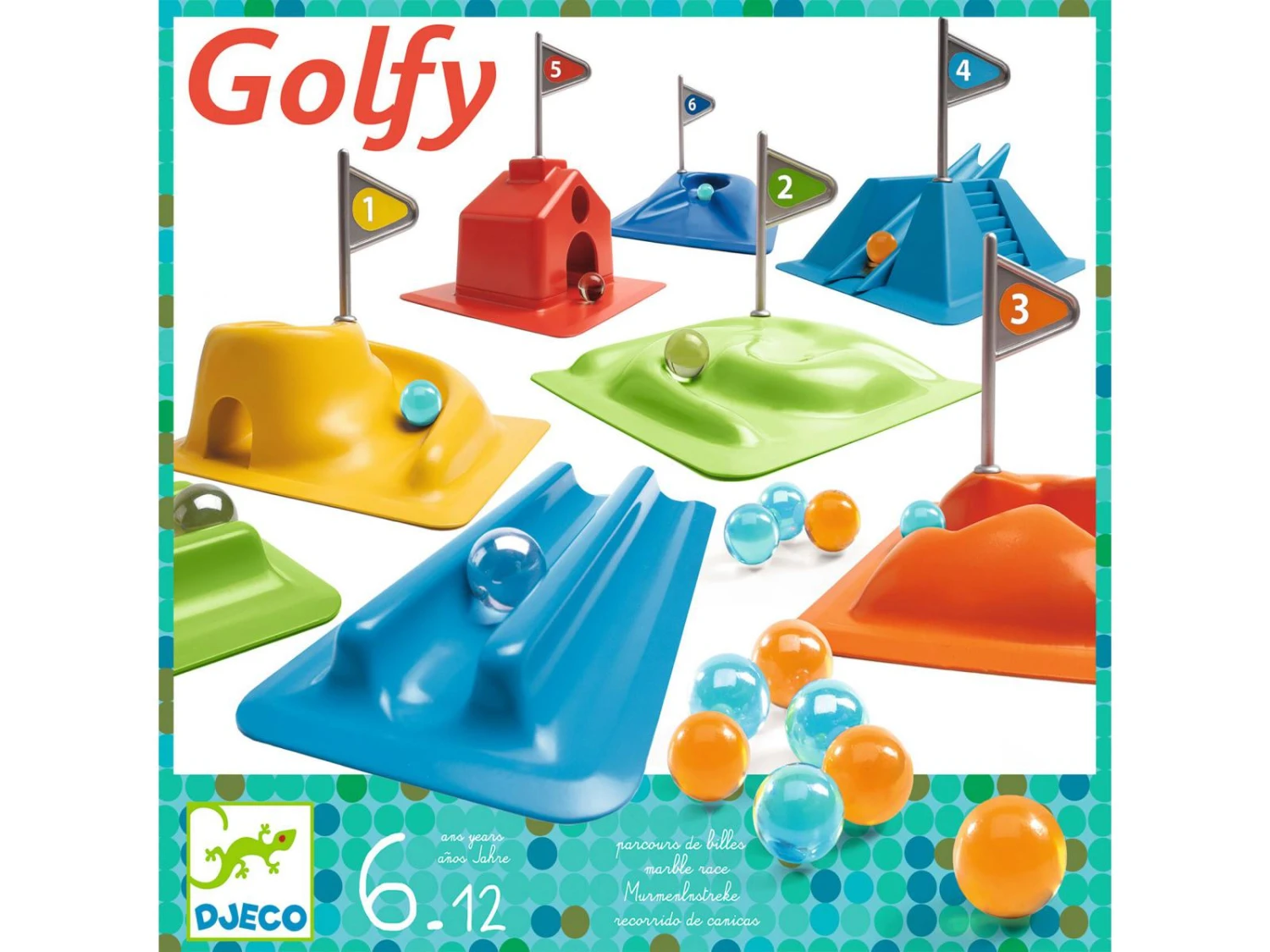 Golfy est un jeu de billes colorées où l’enfant crée des parcours à l’aide des 6 obstacles fournis. 10 billes incluses.