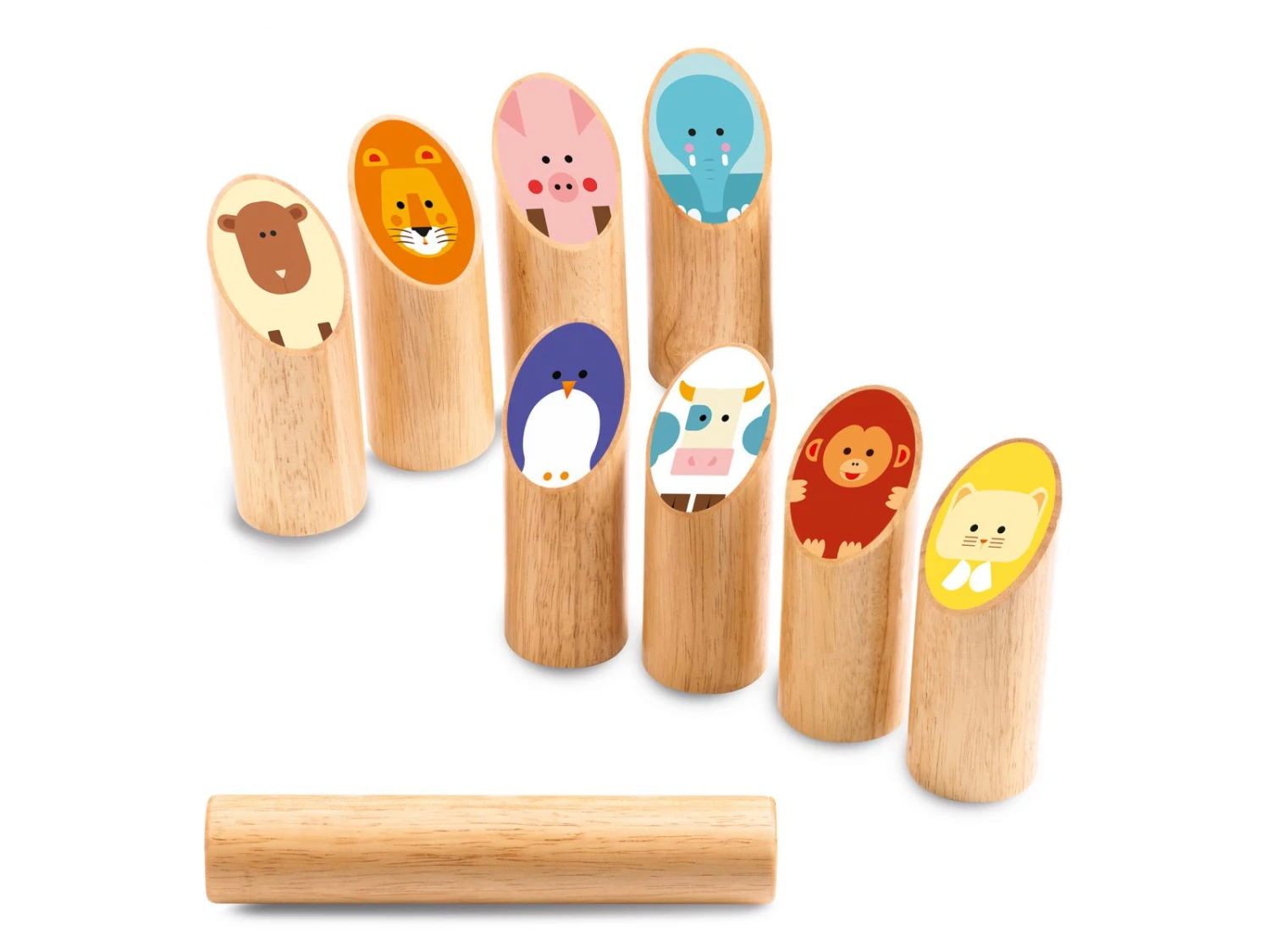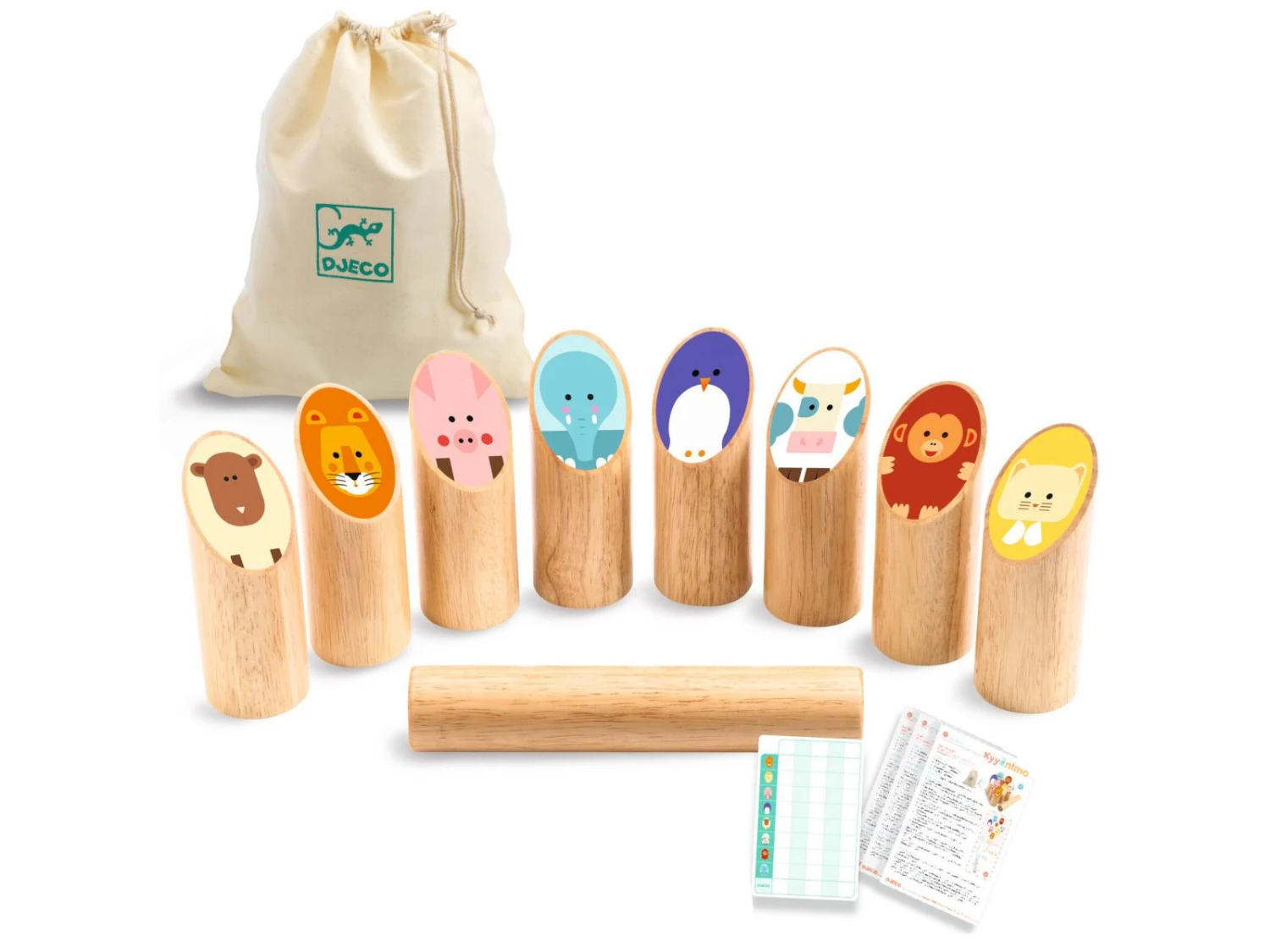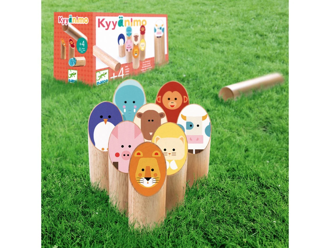 Kyyänimo est un jeu de quilles nordiques pour les plus jeunes joueurs avec un bâton lanceur aux dimensions spécialement adaptées à leurs petites mains, des quilles illustrées d’animaux, et une règle du jeu simplifiée. Dès 4 ans.