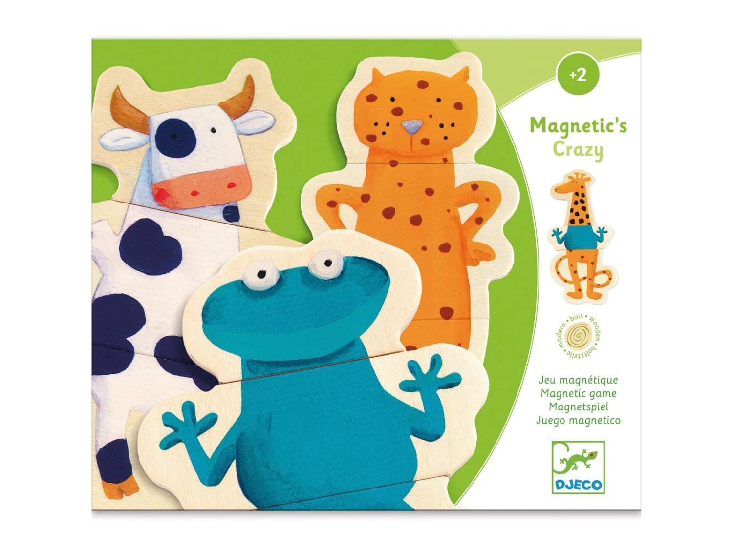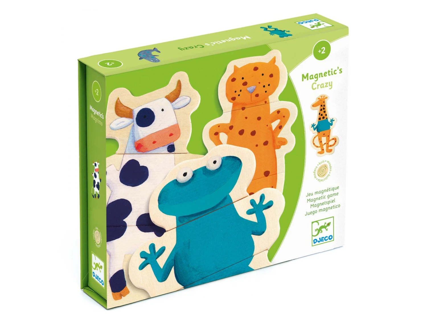 Un coffret de 24 pièces magnétiques en bois pour reconstituer des animaux ou en imaginer d’autres plus farfelus. L’enfant aide le crocodile à retrouver son corps et ses pattes !