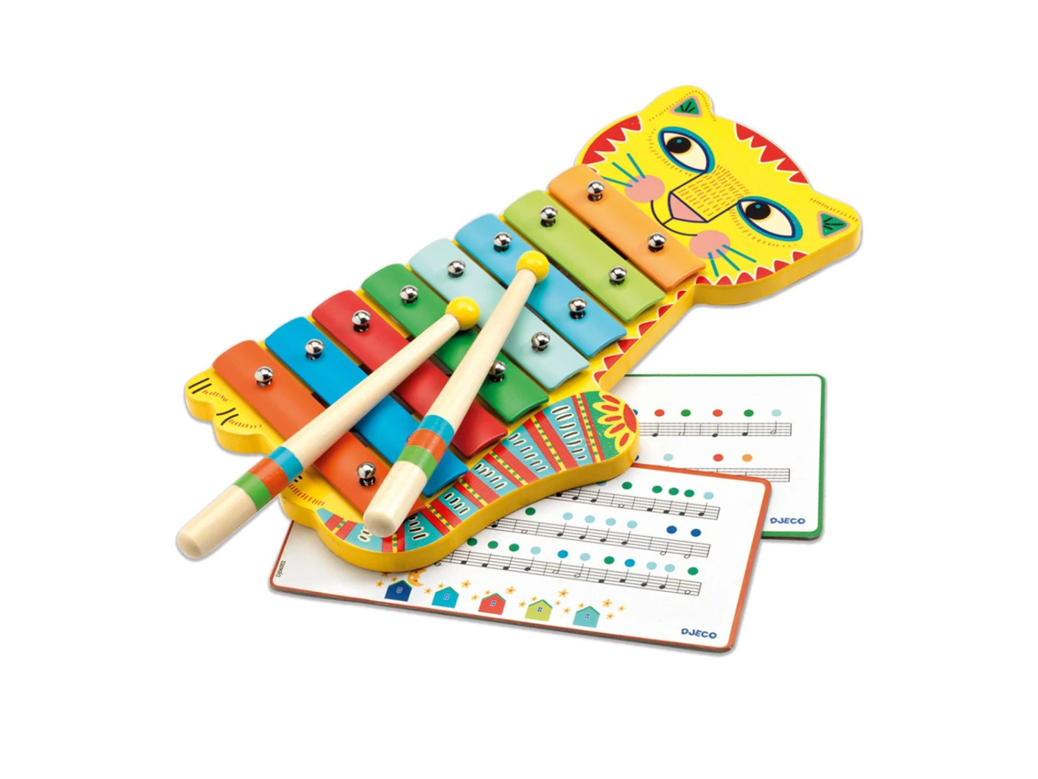 Un magnifique métallophone en forme de chat destiné aux enfants et joliment illustré. L’enfant joue les notes à l’aide des baguettes en bois. Pour le guider sont incluses deux partitions, qui reprennent les codes couleurs des touches. Le cadeau idéal pour les petits musiciens à partir de 3 ans.