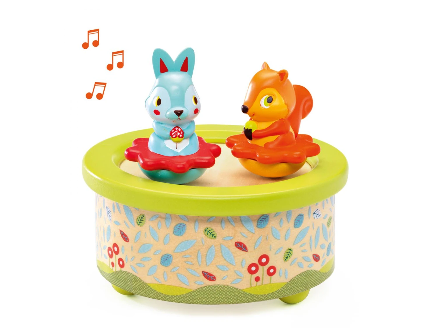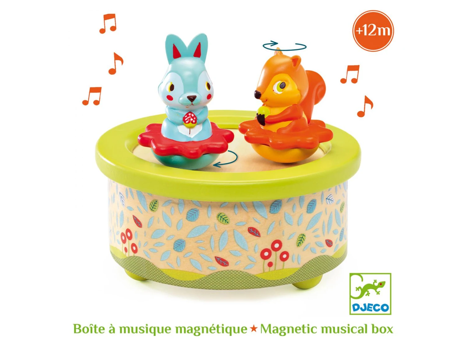 Friends Melody est une boîte à musique magnétique ronde joliment illustrée avec un lapin et un écureuil. Il suffit de remonter la clé et les figurines se mettent à tourner et à danser au son de la musique « Berceuse » de Franz Schubert.