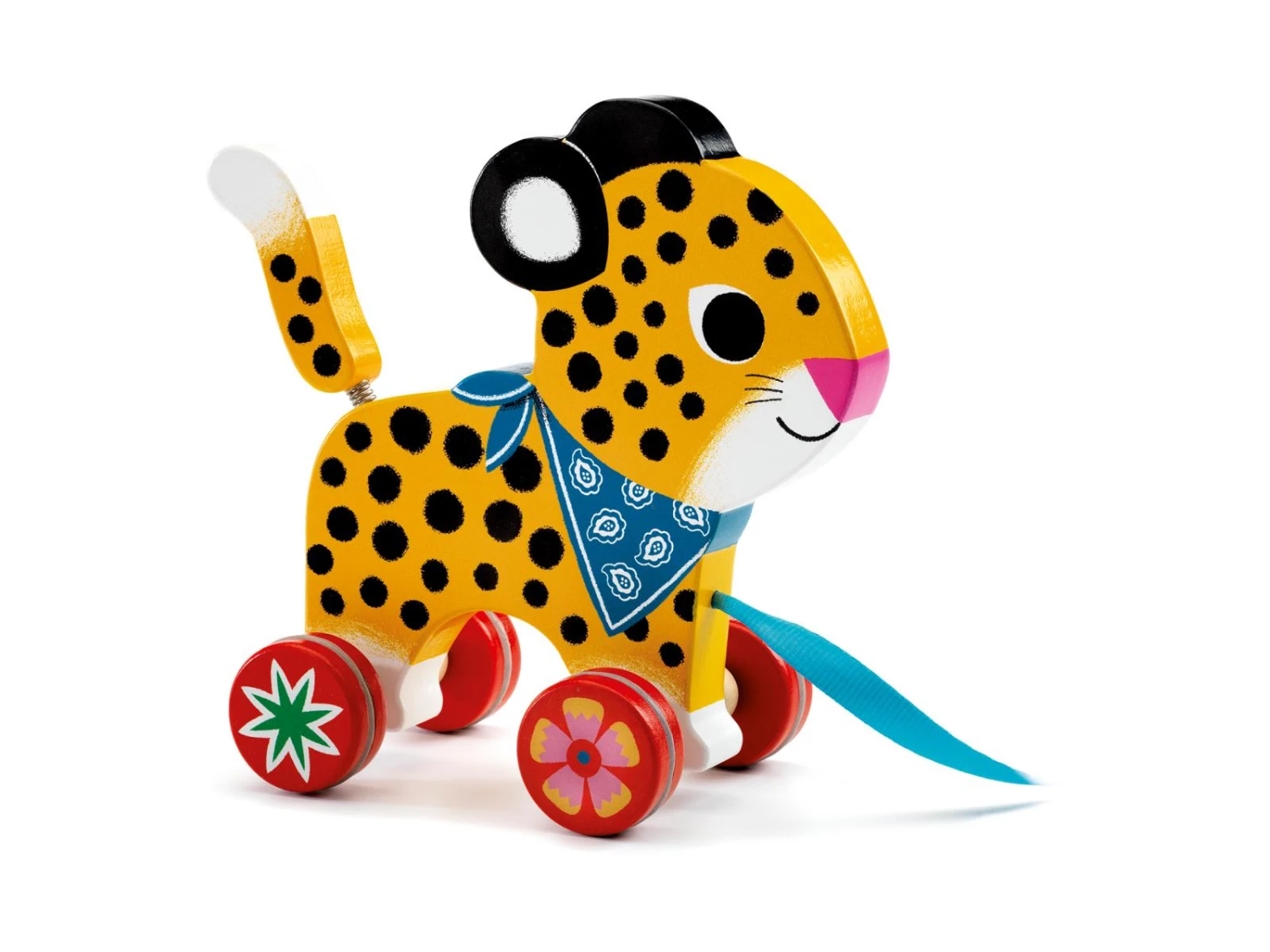 Greta est un petit jouet à traîner en forme de léopard aux couleurs vives. Il se dandine lorsqu’on le promène avec son ruban.