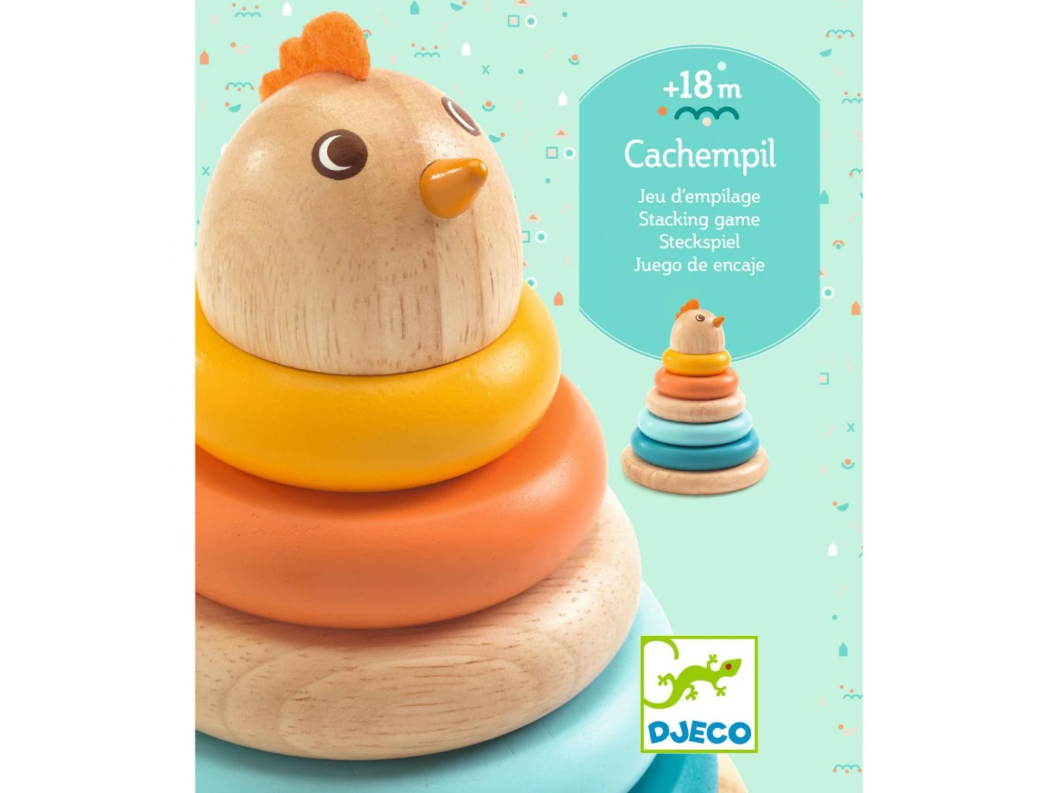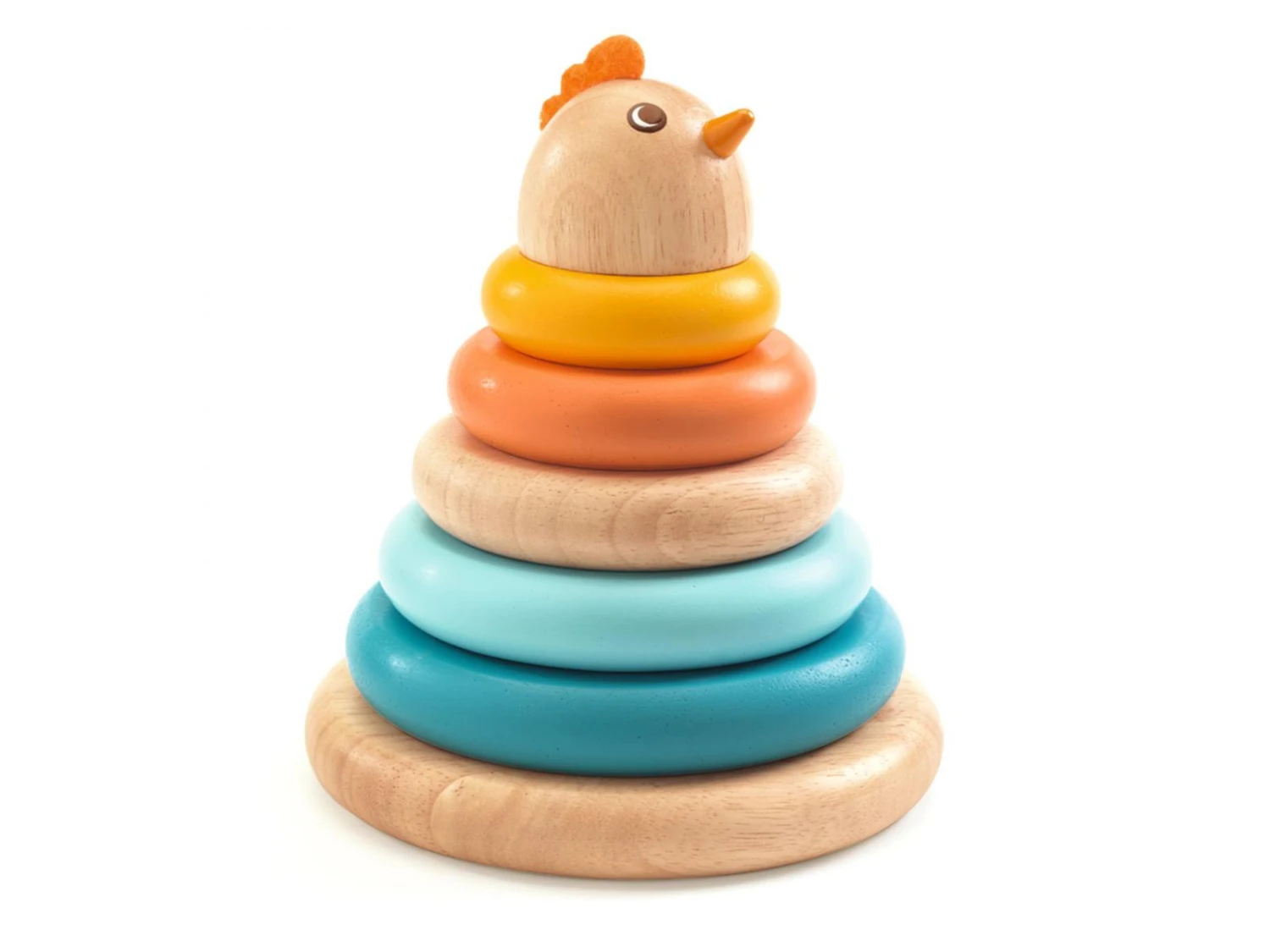 Un jeu d’empilage en bois pour reproduire une poule avec les 5 anneaux. L’enfant empile dans l’ordre les disques du plus grand au plus petit et ajoute la tête de la poule pour terminer son animal. Une surprise à découvrir sous le plus grand des anneaux.