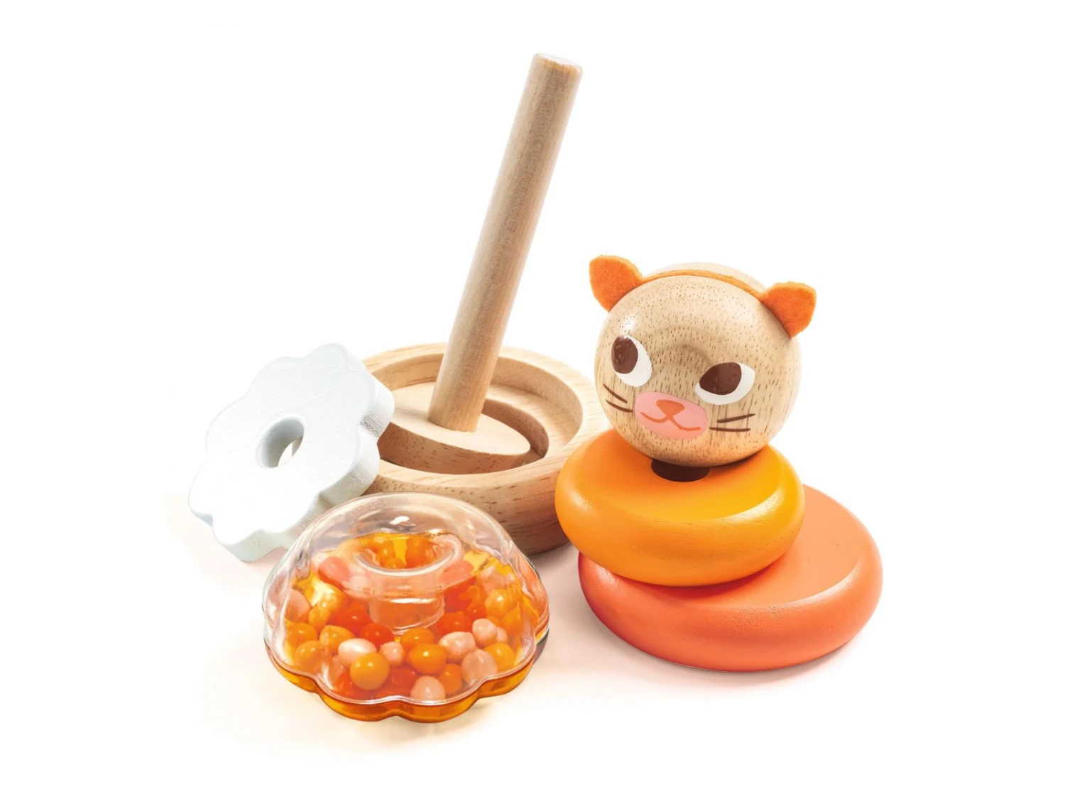 Un jeu d’empilage en bois pour reproduire un chat avec les 4 anneaux. L’enfant empile dans l’ordre les disques du plus grand au plus petit et ajoute la tête du chat pour terminer son animal. Une surprise à découvrir sous le plus grand des anneaux.