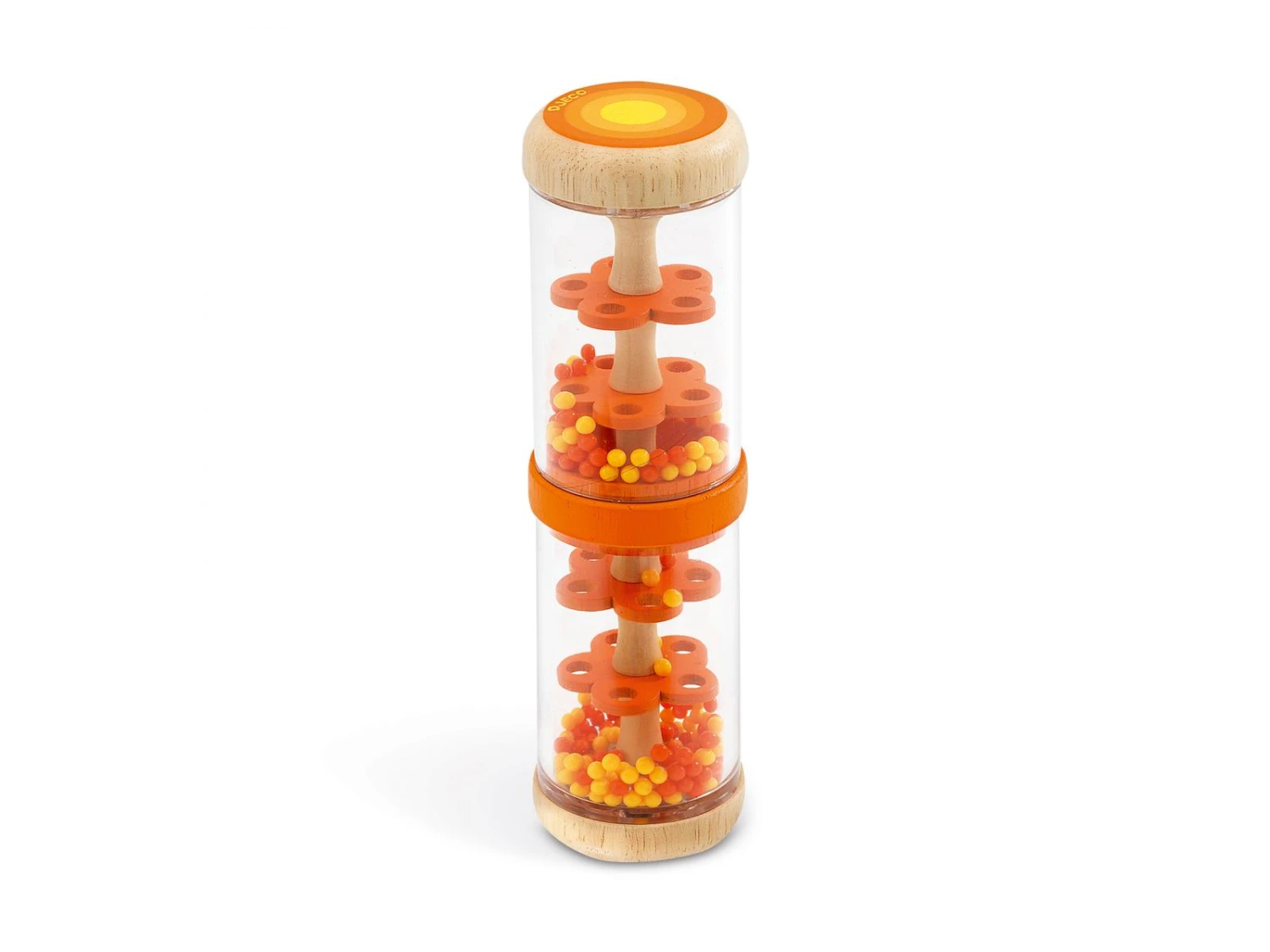 Un bâton de pluie en bois naturel et aux couleurs orangées, destiné aux bébés dès 12 mois. Le bébé retourne et secoue le bâton pour voir les billes tomber et écouter le doux son de la pluie.