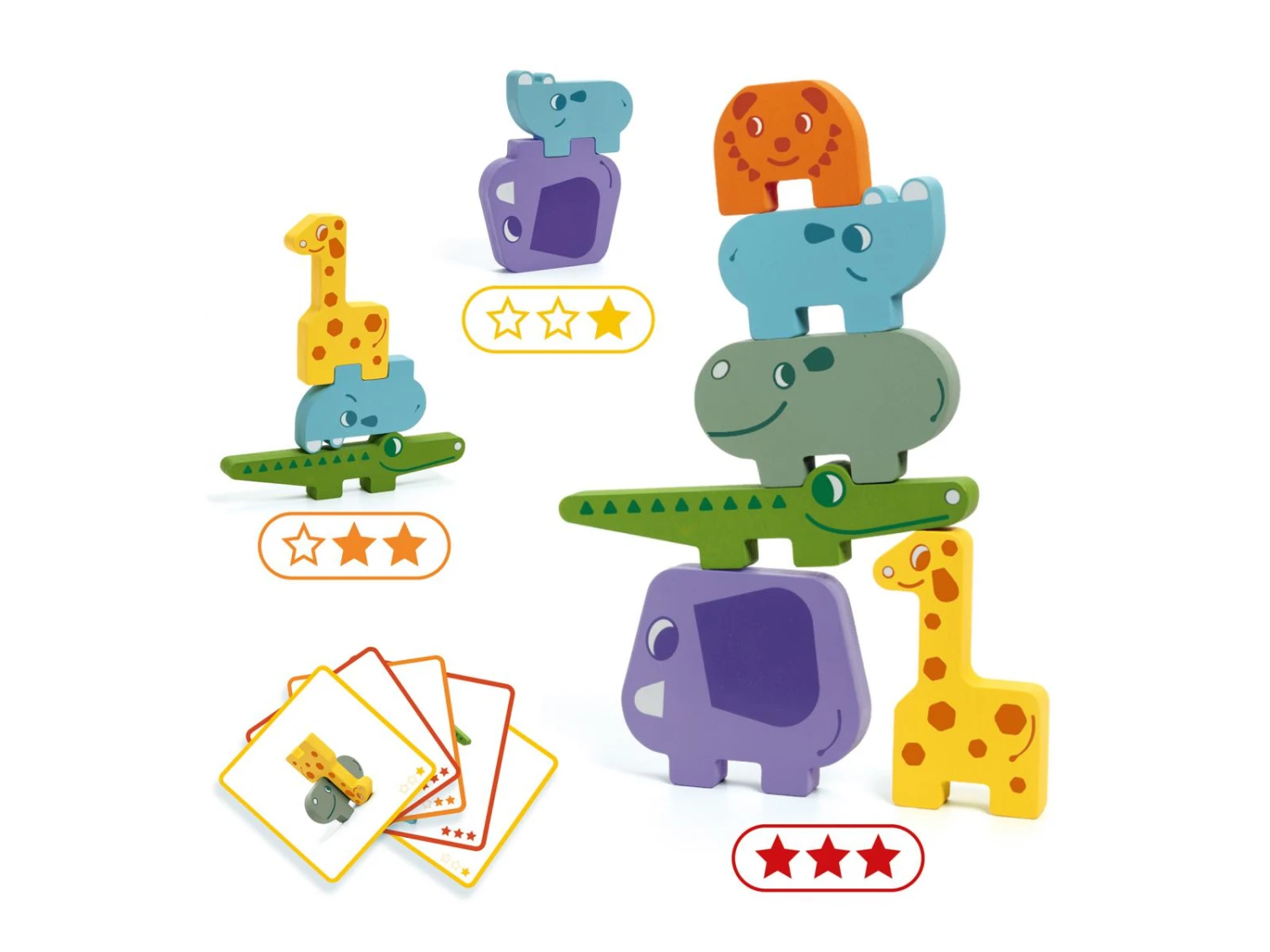 Ze Totanimo est un jeu en bois d’équilibre et de répérage dans l’espace. Six animaux en bois avec lesquels l’enfant joue pour reproduire les totems indiqués sur les cartes modèles. Plusieurs niveaux pour jouer progressivement dès 3 ans.