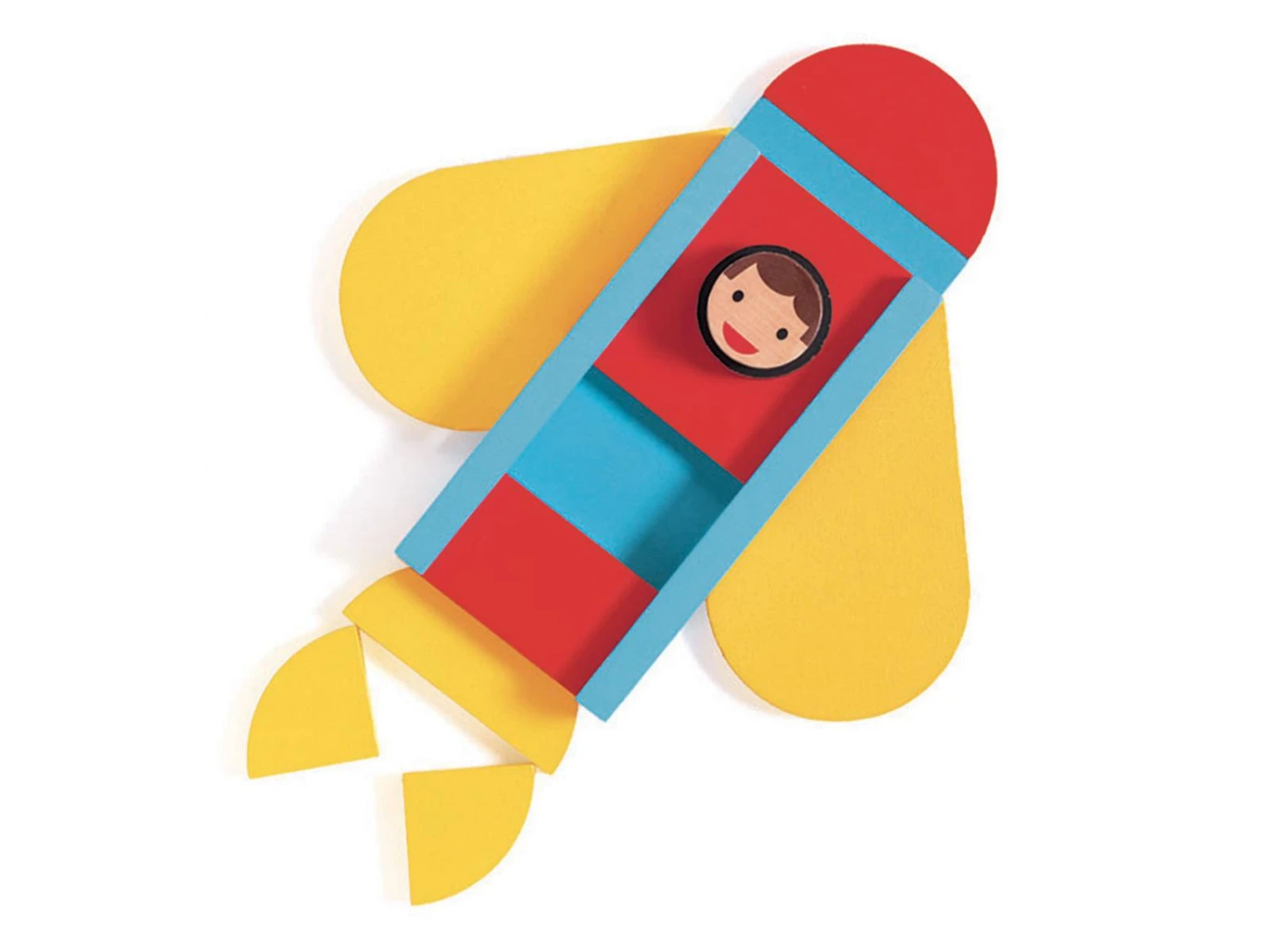 Un jeu de construction en bois pour créer des véhicules colorés. L’enfant utilise les pièces en bois en les plaçant côte à côte ou en les superposant pour reproduire les véhicules des cartes modèle.