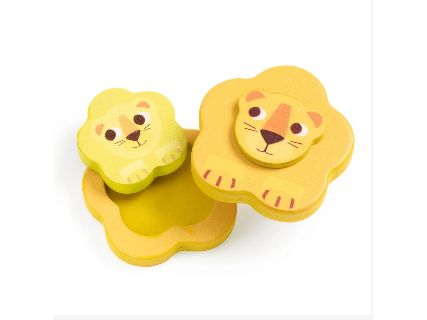 Jeu de cache-cache magnétique. Cinq animaux sauvages qui s’ouvrent en laissant apparaître un bébé de la forme géométrique du parent.