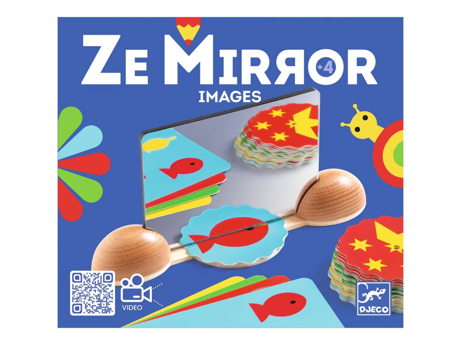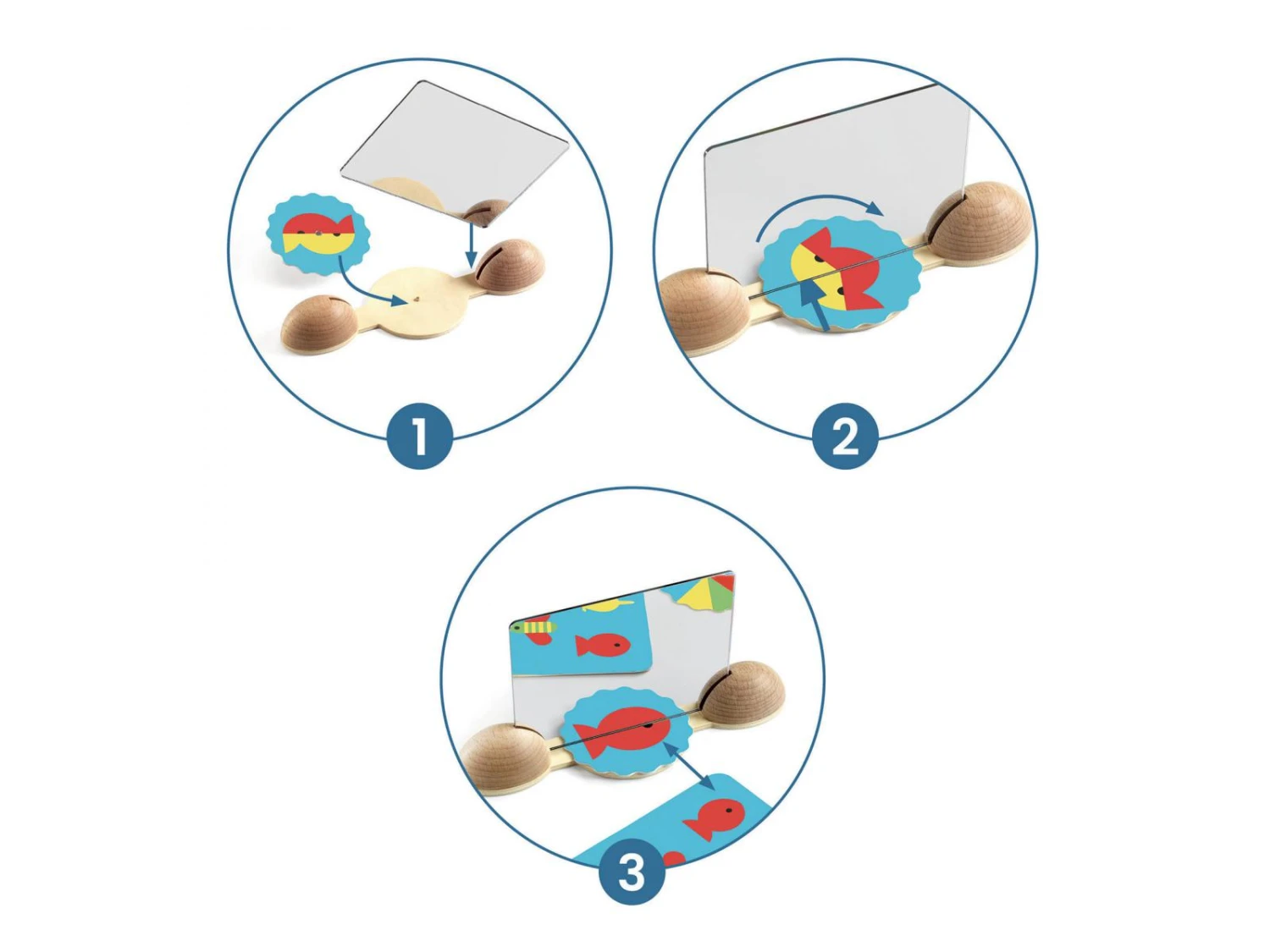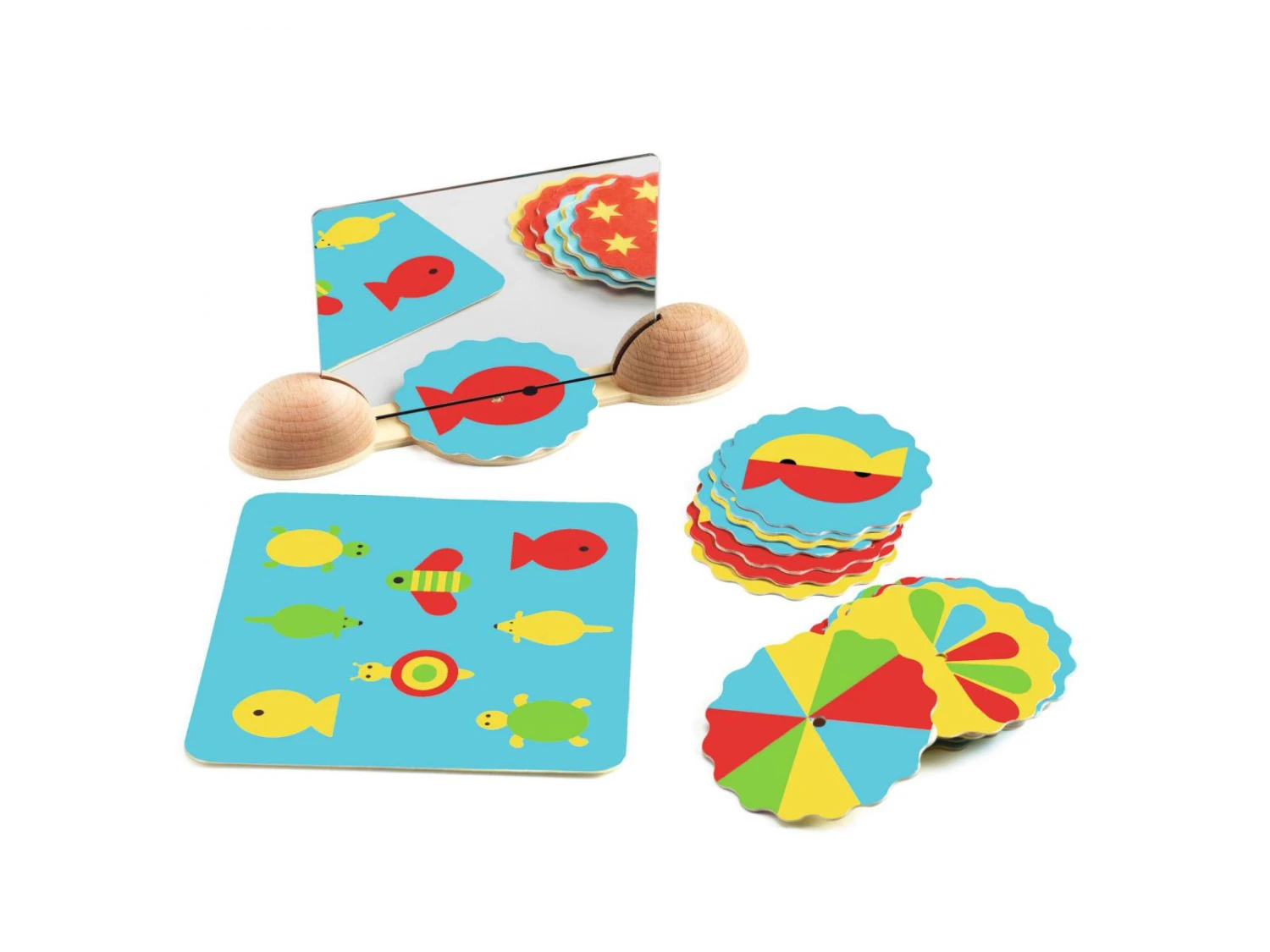 Dans ce coffret découverte, l’enfant place l’image sous le miroir et la tourne jusqu’à ce qu’il trouve l’une des images présentes sur les cartes.