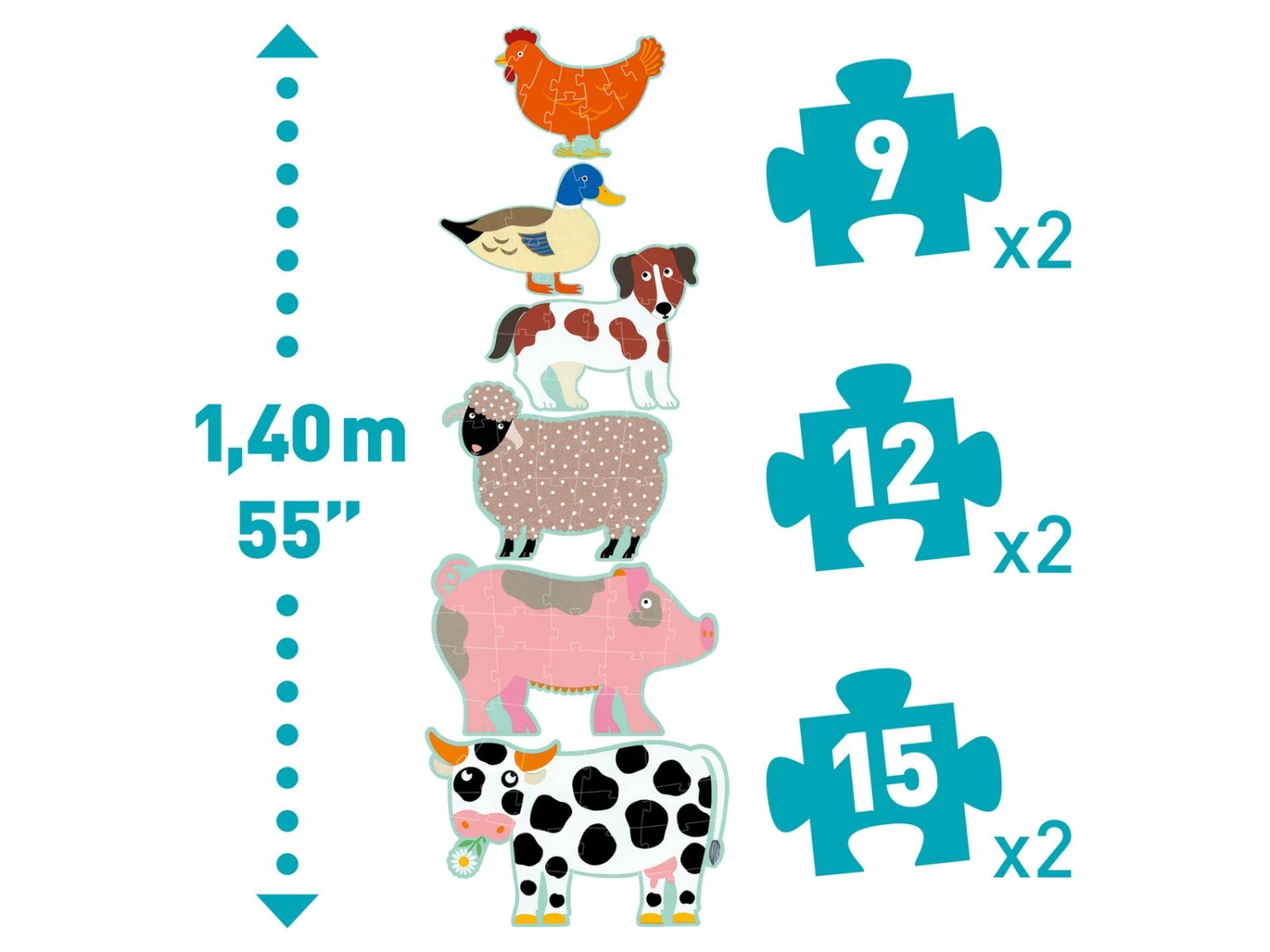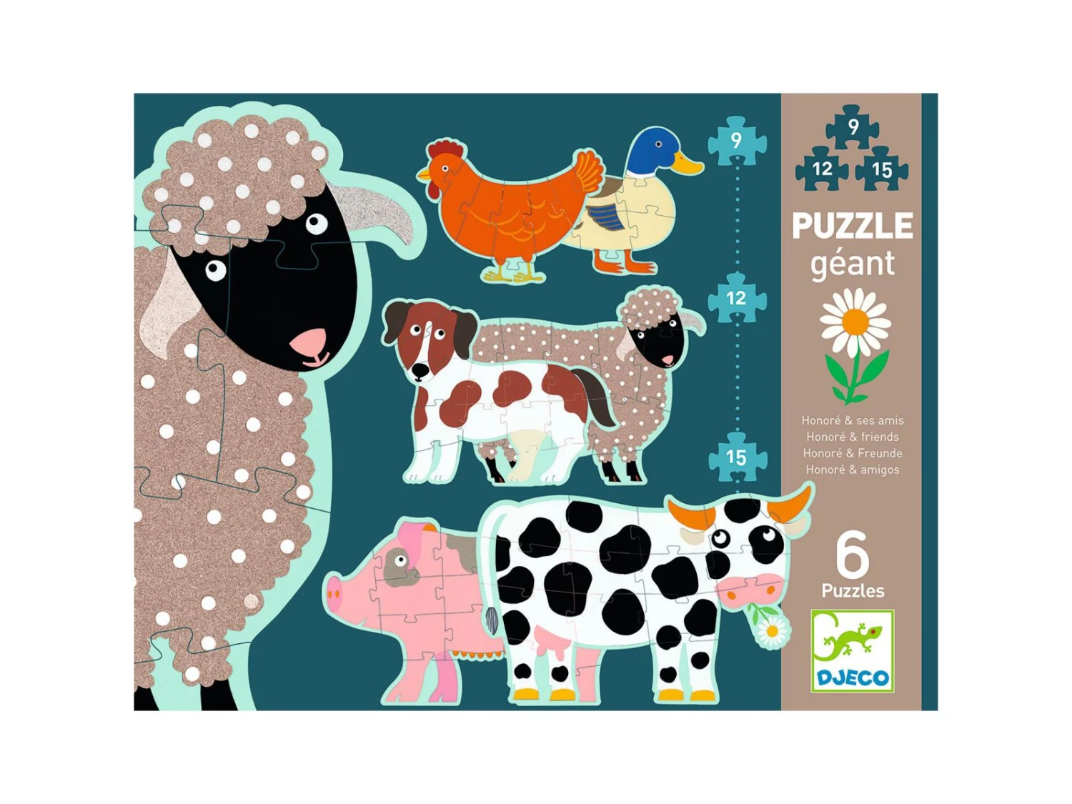 « Honoré et ses amis » est un coffret qui comprend 6 puzzles géants, évolutifs et silhouettés de 9, 12 et 15 pièces. L’enfant assemble les différents animaux de la ferme, une poule, un canard, un chien, un mouton, un cochon et une vache. Après les avoir assemblés, l’enfant les superpose pour créer une grande pyramide de 1,40 m.