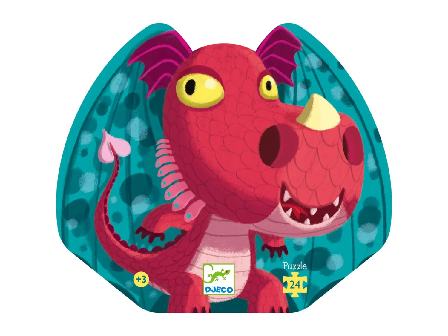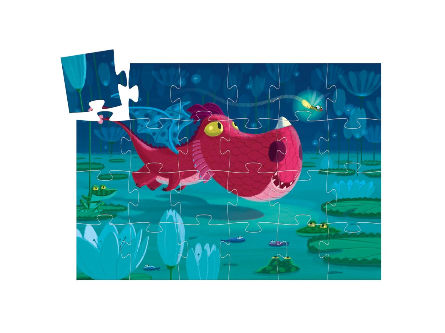 Edmond le gentil dragon vole au-dessus de la mare remplie de grenouilles et de poissons… Un magnifique puzzle de 24 pièces dans une boîte élégante en forme de dragon.