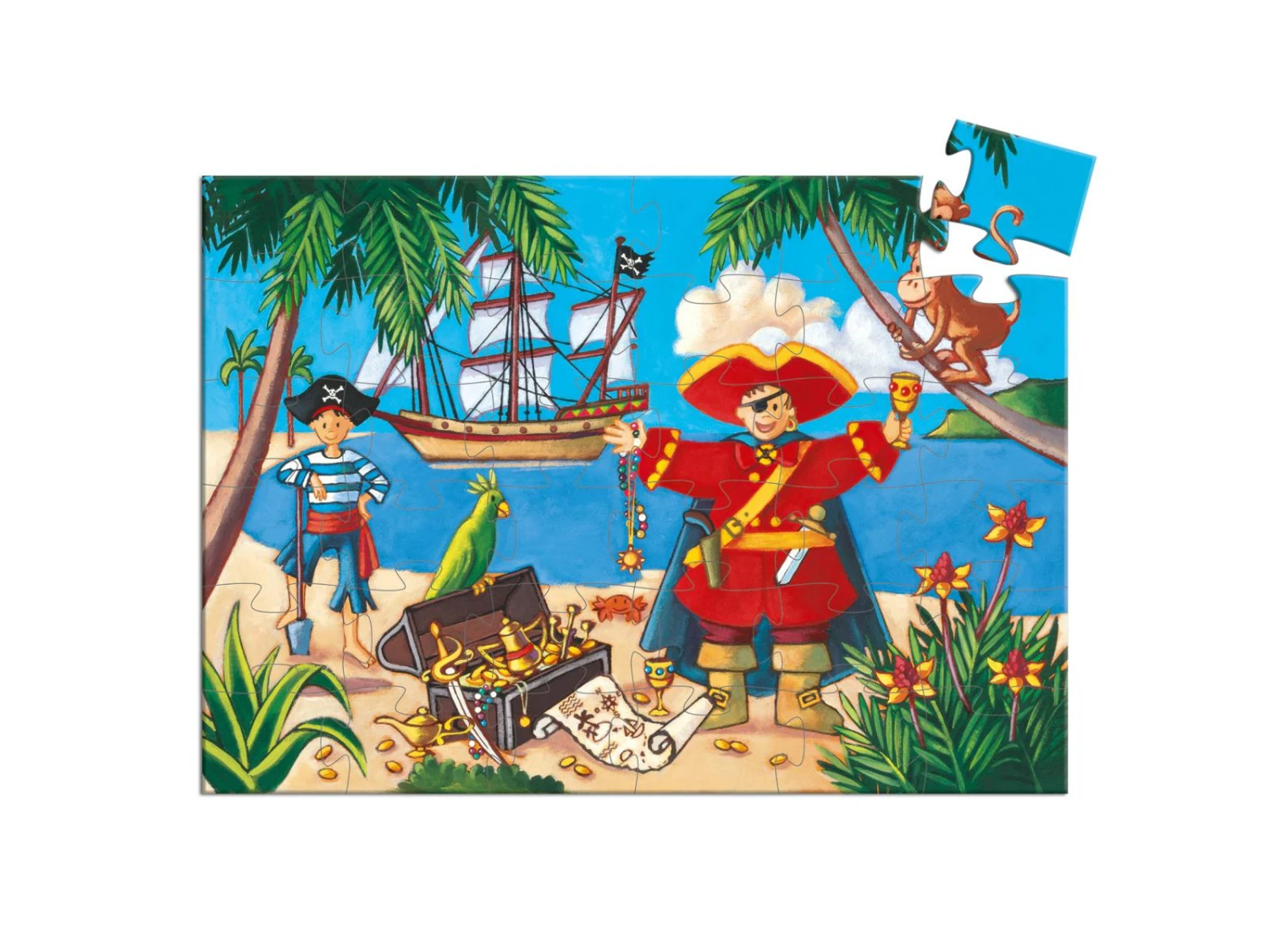 Un pirate part à la recherche du trésor accompagné de son perroquet. Un magnifique puzzle de 36 pièces dans une boîte élégante en forme de pirate.