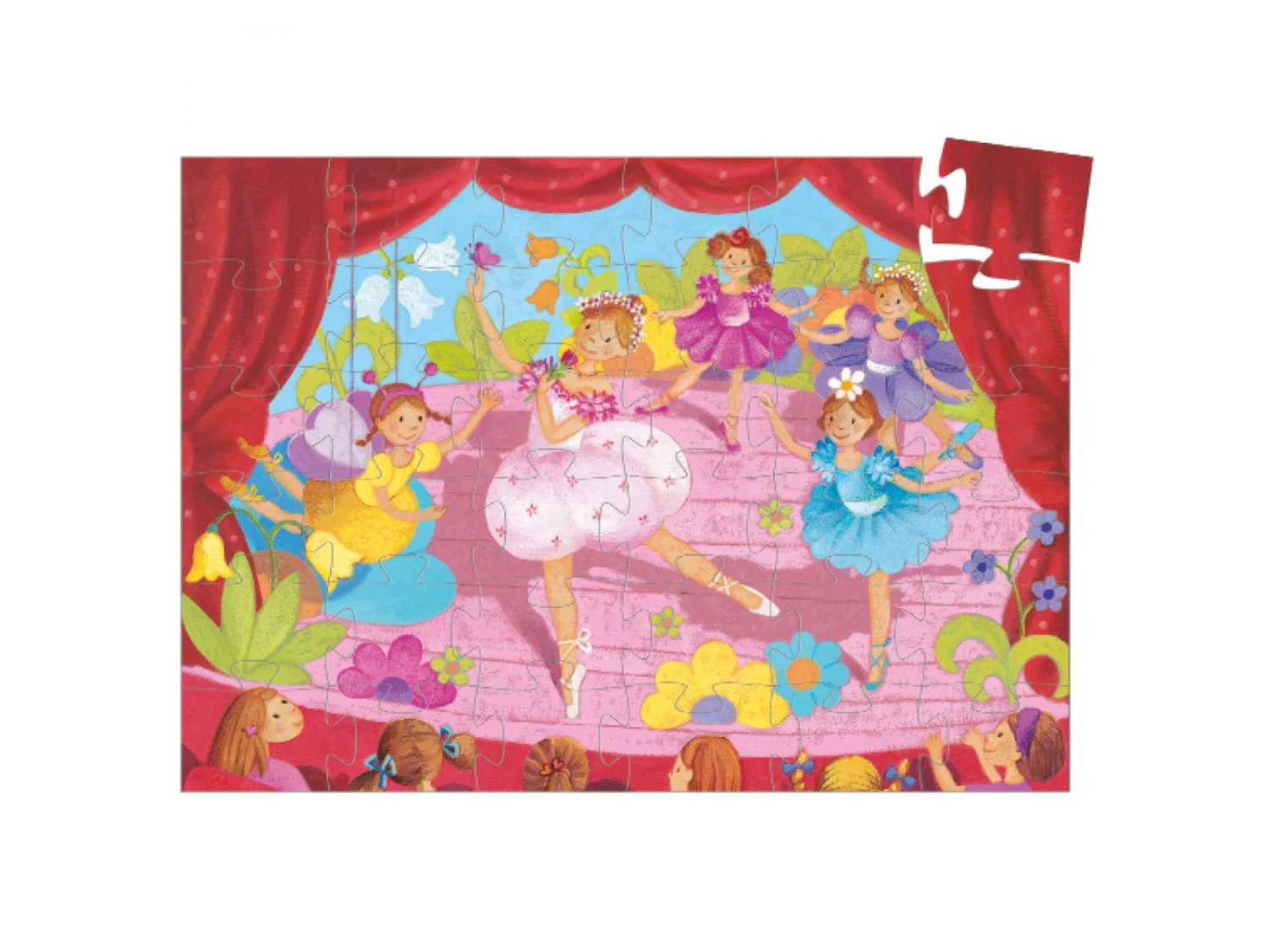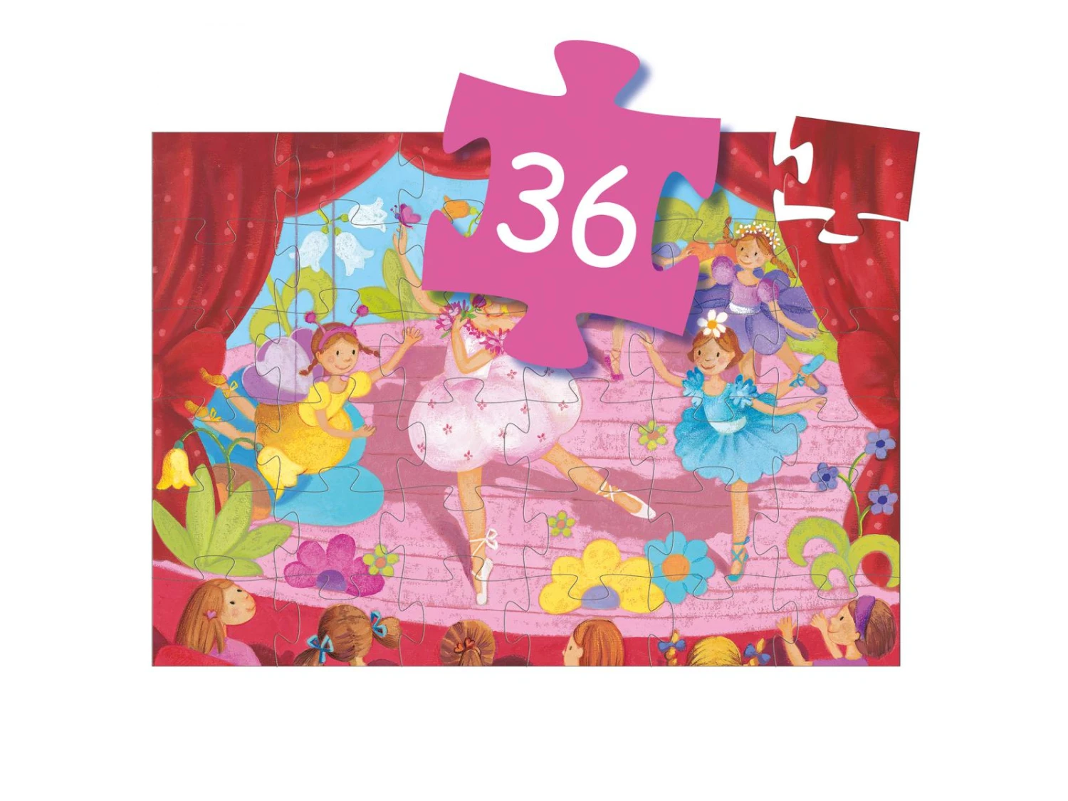 Assistons au spectacle des ballerines sur le thème des fleurs. Un joli puzzle de 36 pièces dans une boîte élégante en forme de ballerine.