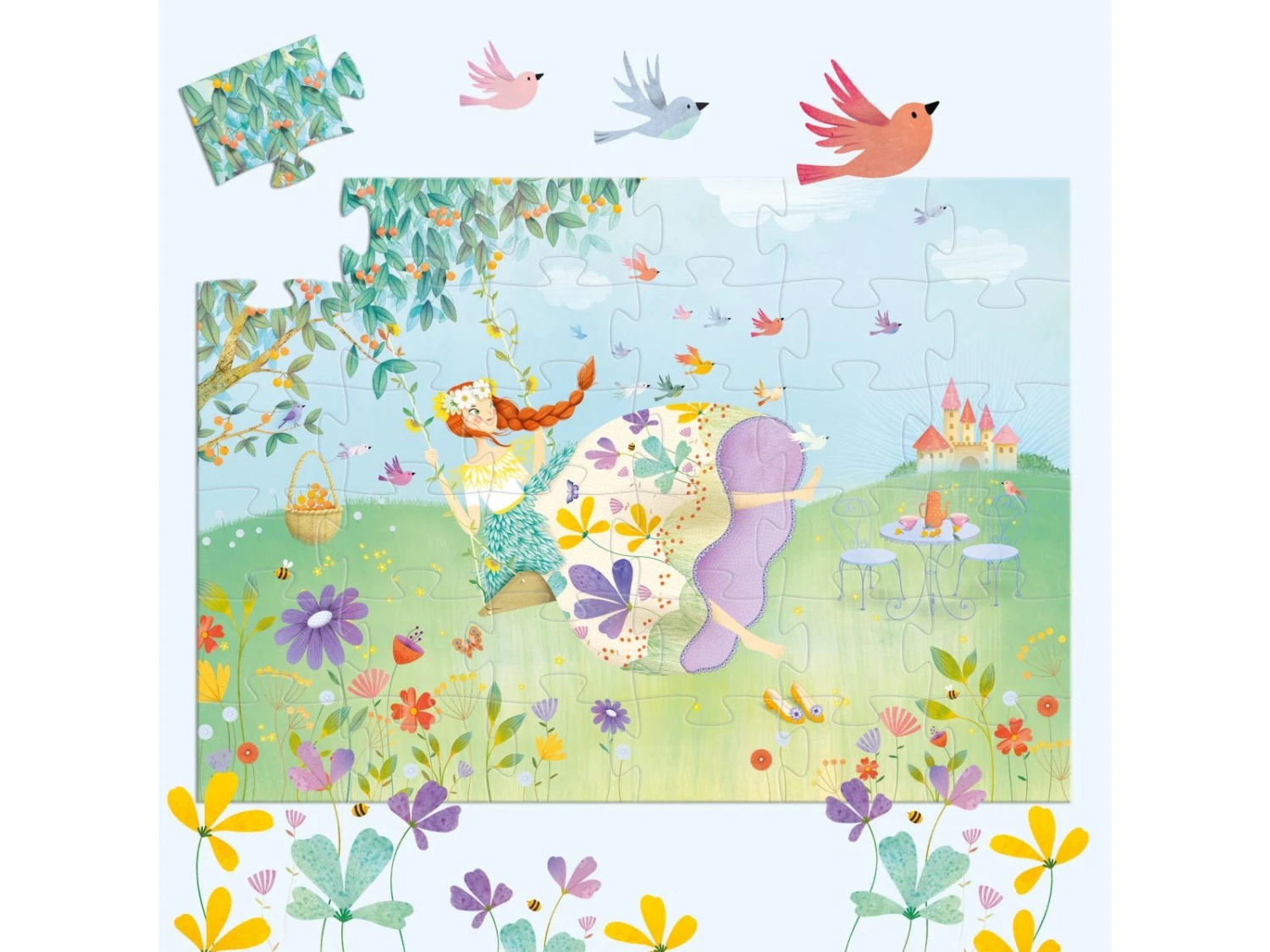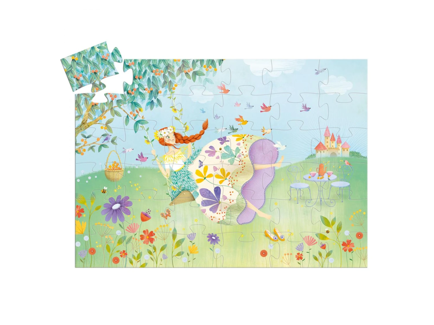 Une jolie princesse profite du printemps sur sa balançoire au milieu d’un champ fleuri. Un magnifique puzzle de 36 pièces dans une boîte élégante en forme de princesse.