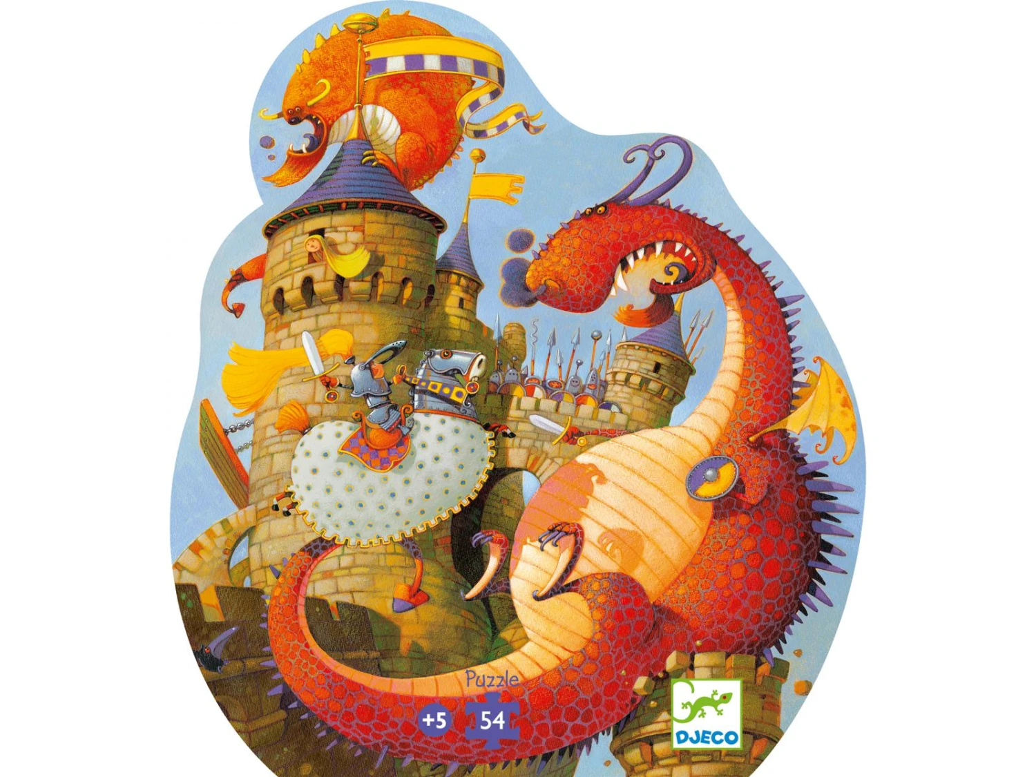 Le chevalier Vaillant combat les dragons pour sauver la princesse dans le château. Un magnifique puzzle de 54 pièces dans une boîte élégante en forme de château.
