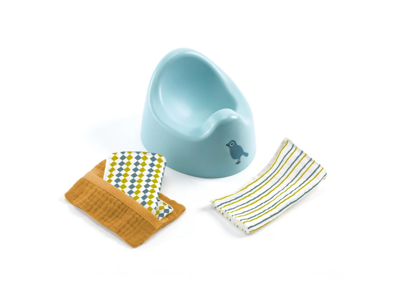 Un pot et un étui avec deux lingettes douces en tissu double gaze : des accessoires incontournables pour les premiers pas vers la propreté de sa poupée !