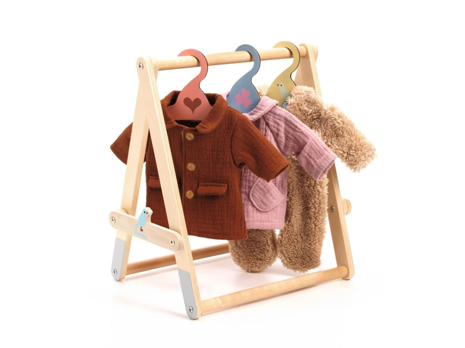 Un porte-vêtements POMEA en bois pour suspendre les habits des poupées sur les trois cintres.