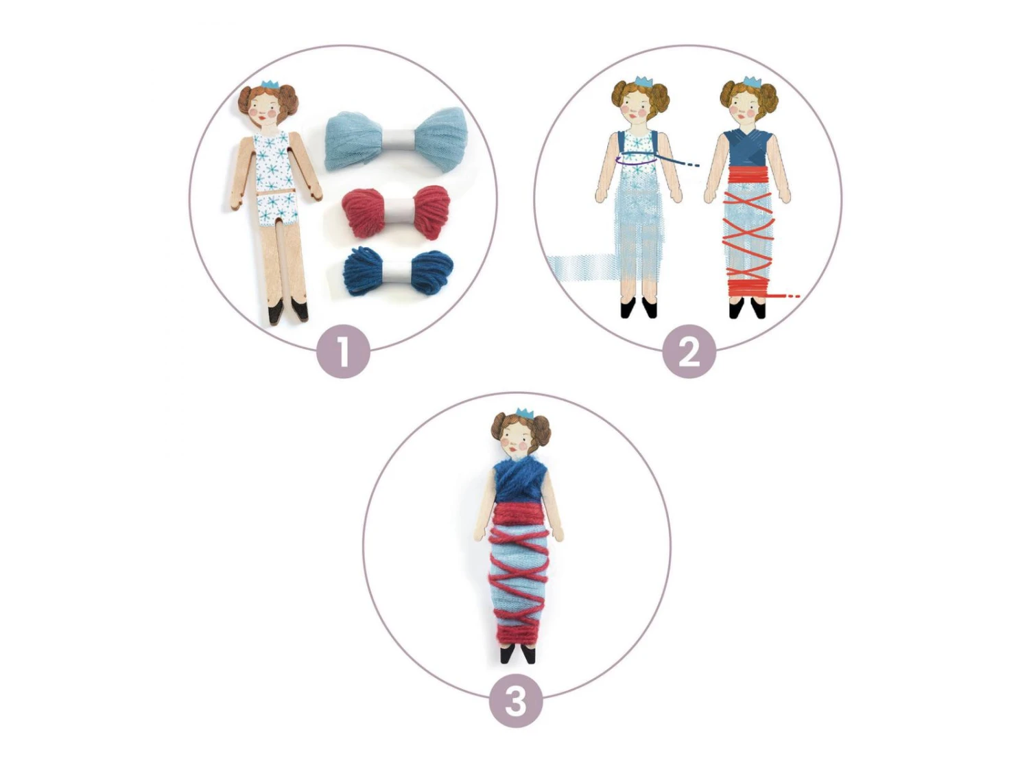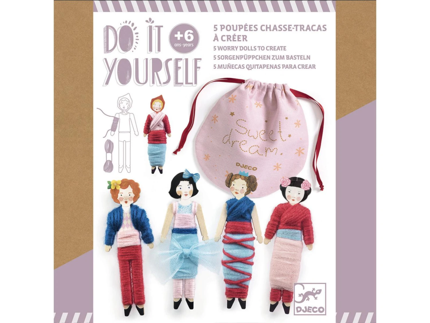5 poupées chasse-tracas à créer : les petites poupées sont à vêtir en les enrubannant de laines et de tulles colorés fournis dans le kit. Une fois habillées, les enfants n’ont plus qu’à leur confier leurs soucis et à les glisser sous leur oreiller dans le joli pochon fourni. Inspirées d’une tradition du Guatemala, ces petites poupées s’occupent de chasser les petits tracas et permettent aux enfants de passer une douce nuit.