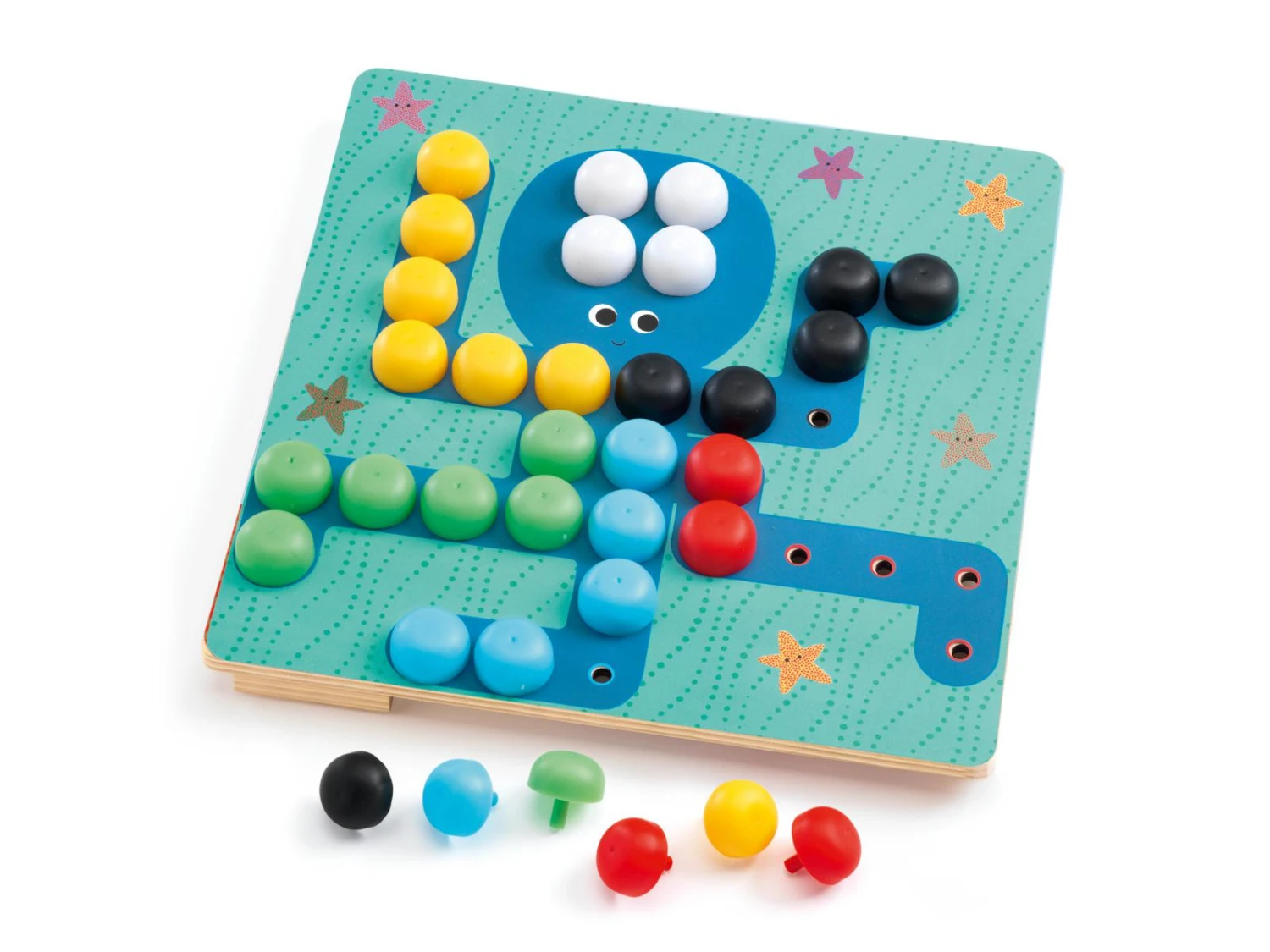 Un jeu de mosaïque adapté aux plus petits dès 3 ans pour créer de fabuleux tableaux en complétant les 8 dessins avec les picots de couleur.