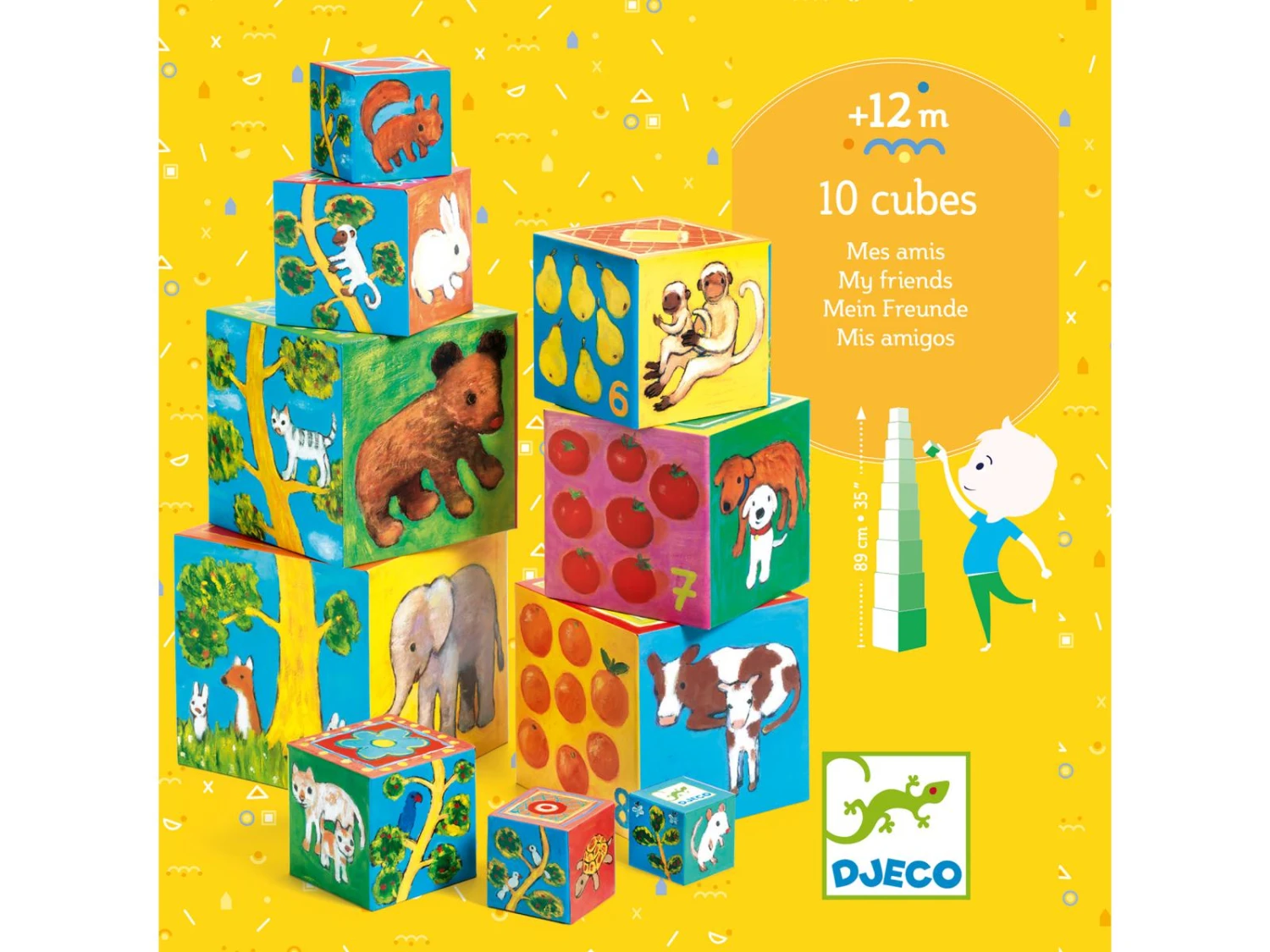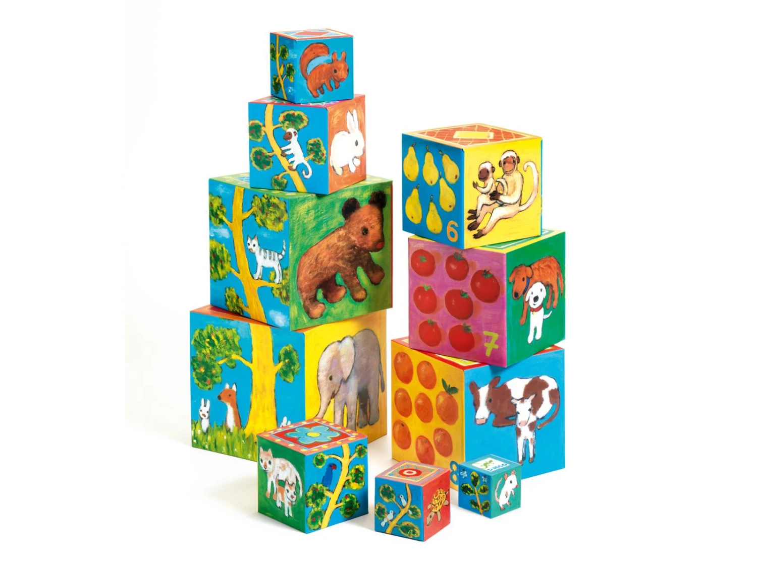 10 cubes gigognes en carton épais à emboîter, empiler et faire tomber à volonté ! L’enfant empile les cubes de façon à ce que les illustrations créent une suite logique.