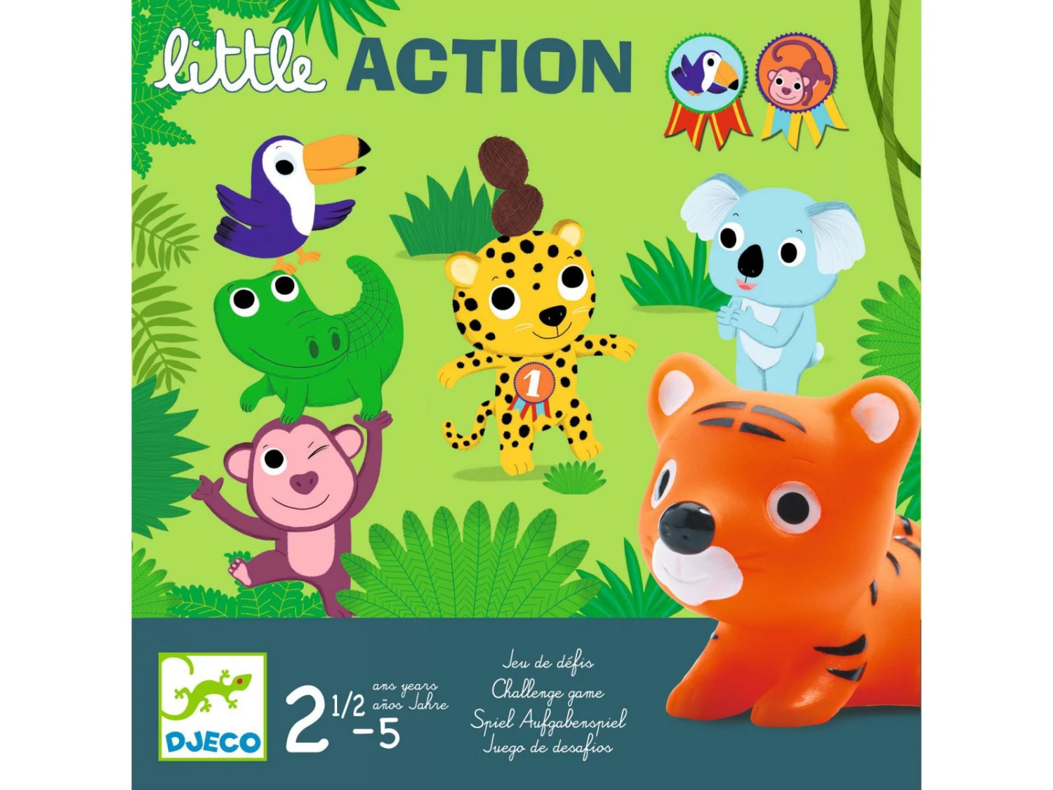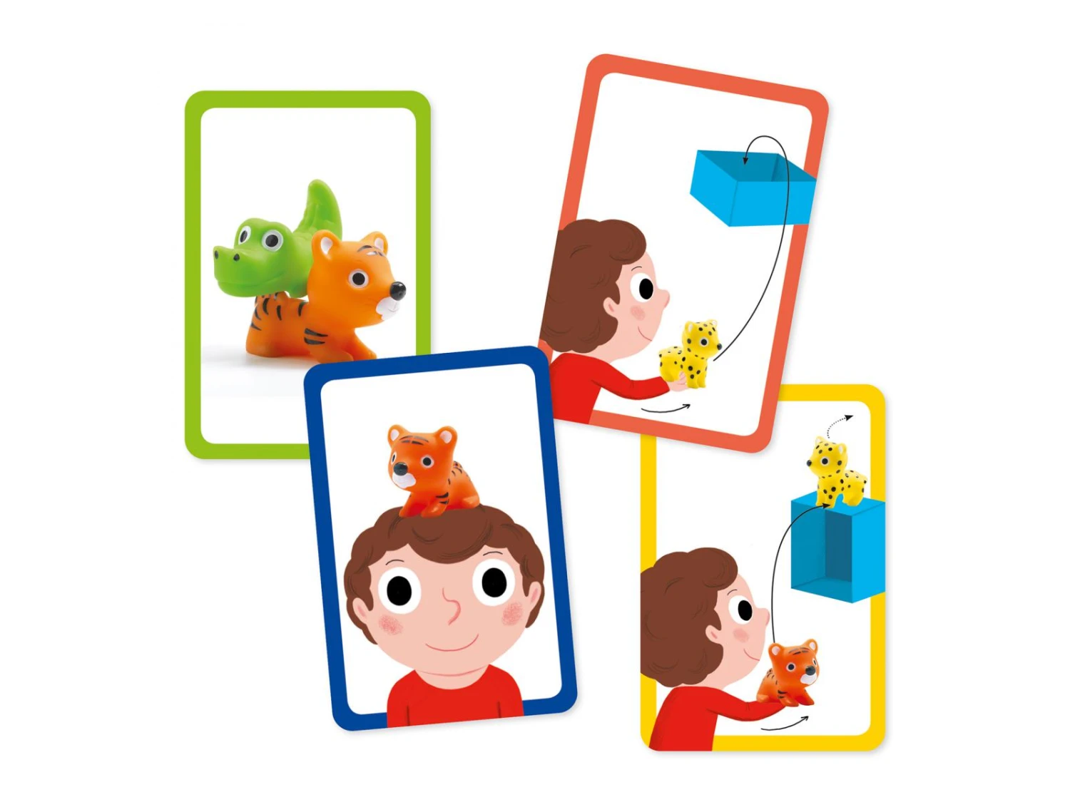 Un jeu d’action spécialement conçu pour les tout-petits dès 2 ans ½. C’est la fête dans la jungle ! Construire une pyramide, jouer aux quilles, lancer et attraper les animaux… Autant de défis à réussir pour gagner des médailles et remporter la partie ! L’enfant suit les cartes défis et remporte les missions en jouant avec les adorables animaux en plastique souple.