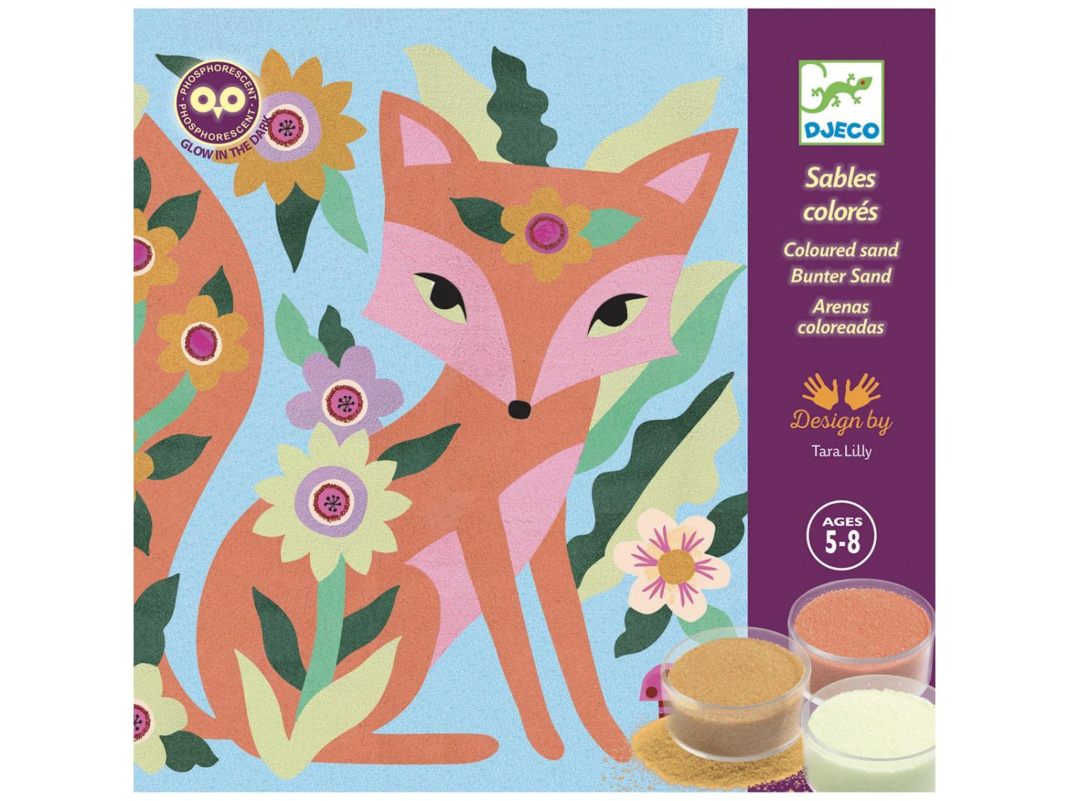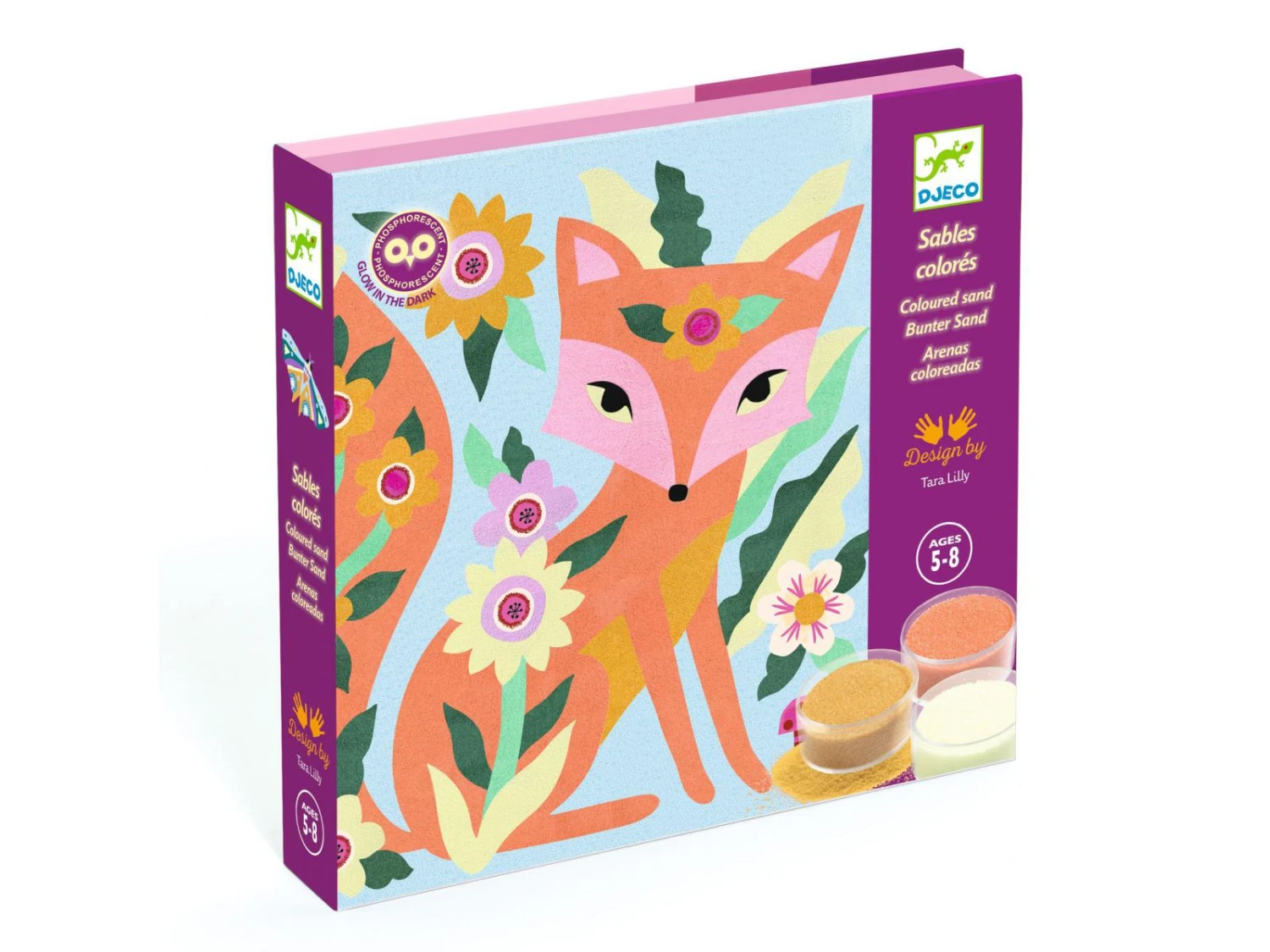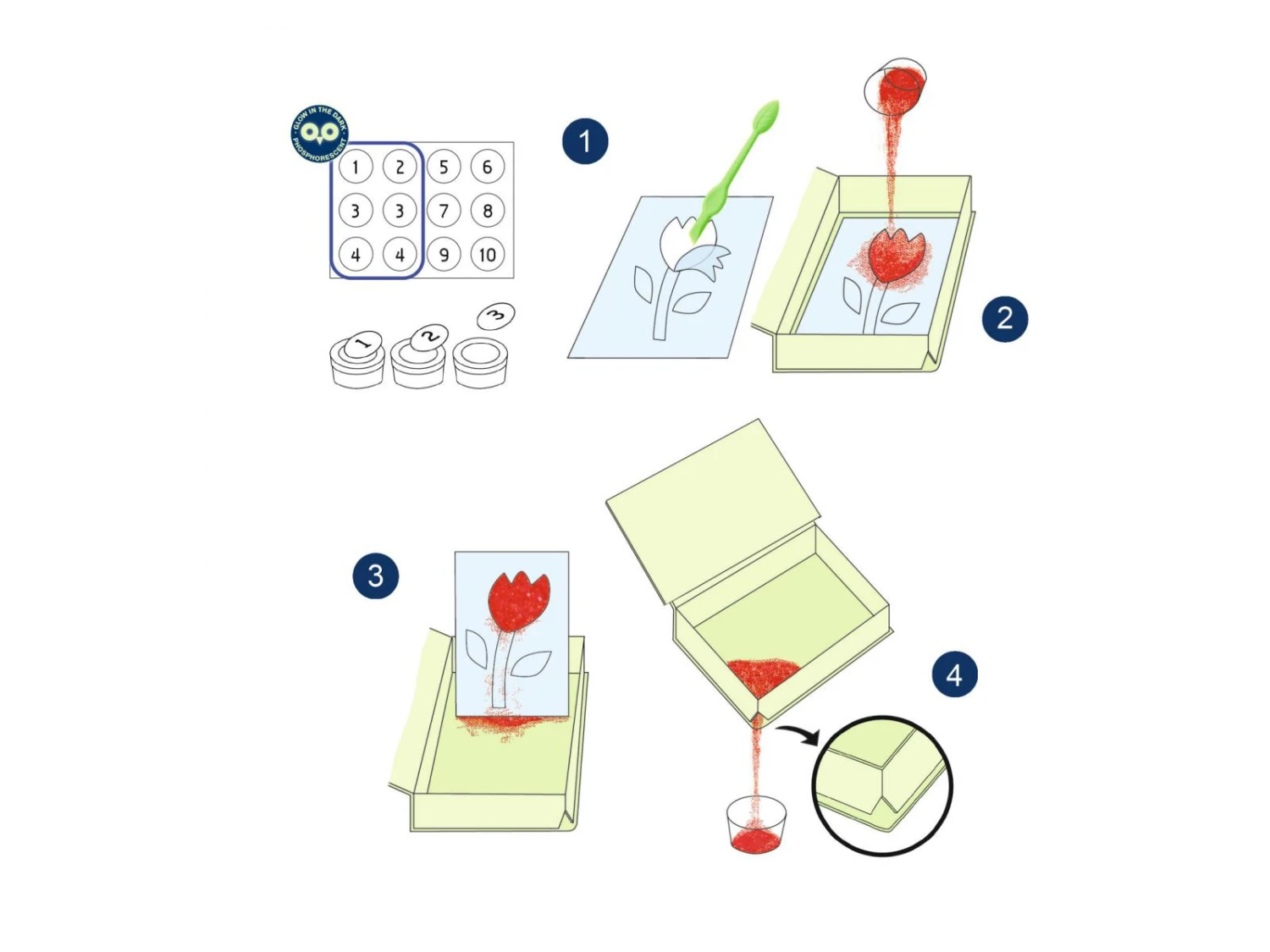 4 tableaux présentant des animaux nocturnes à mettre en couleurs avec des sables colorés et phosphorescents. L’enfant place son tableau dans la boîte, il dévoile les zones préencollées grâce à l’outil fourni puis les saupoudre de sable en suivant le code couleurs indiqué dans le livret. Une fois les tableaux exposés, quelle surprise à la nuit tombée : les illustrations se révèlent dans le noir !