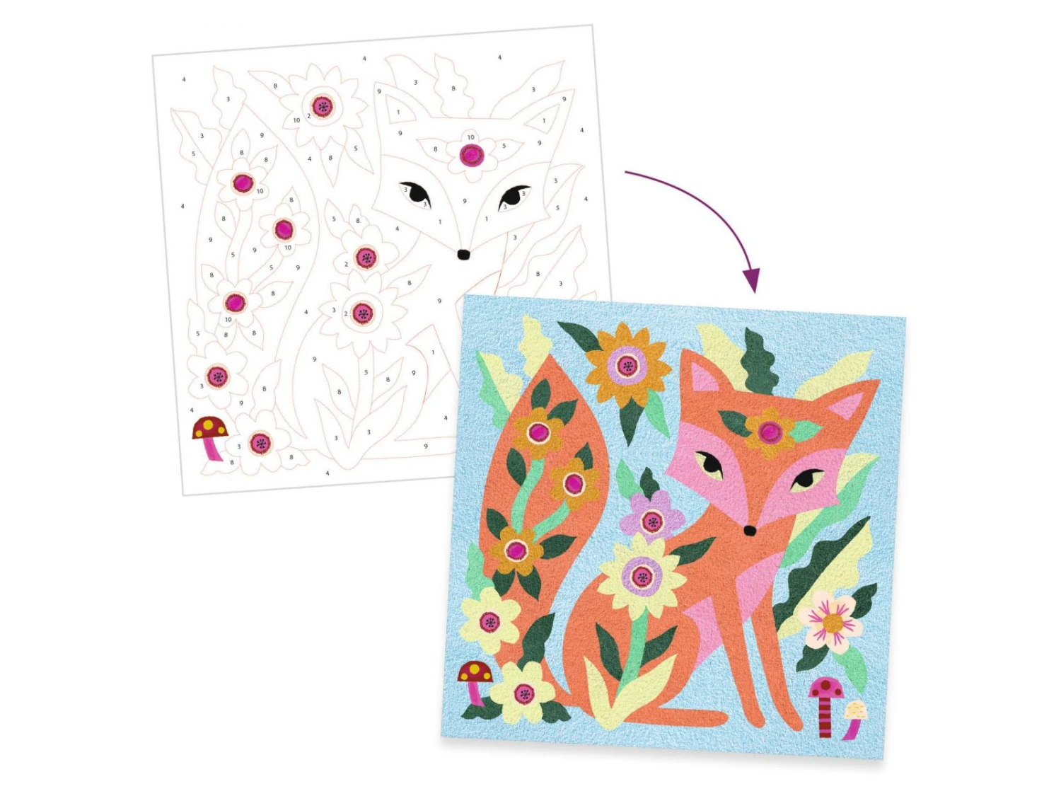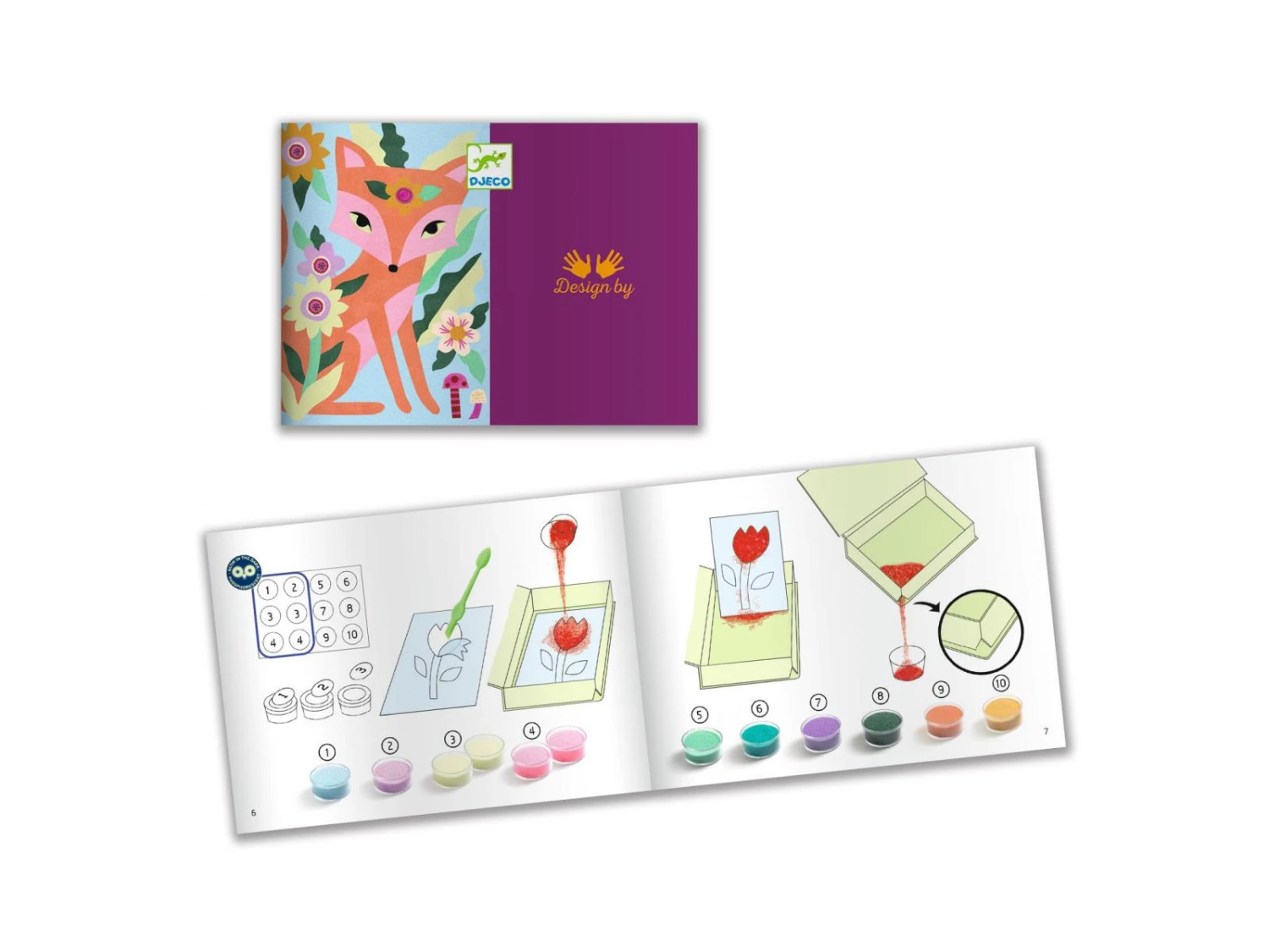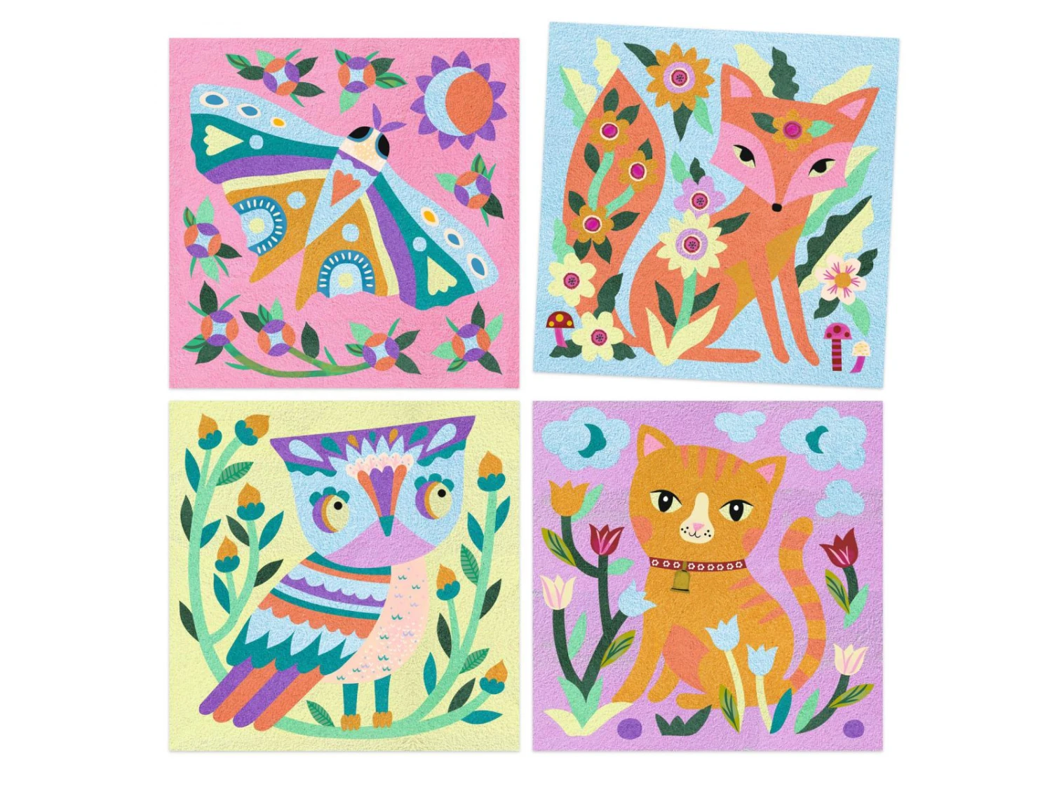 4 tableaux présentant des animaux nocturnes à mettre en couleurs avec des sables colorés et phosphorescents. L’enfant place son tableau dans la boîte, il dévoile les zones préencollées grâce à l’outil fourni puis les saupoudre de sable en suivant le code couleurs indiqué dans le livret. Une fois les tableaux exposés, quelle surprise à la nuit tombée : les illustrations se révèlent dans le noir !