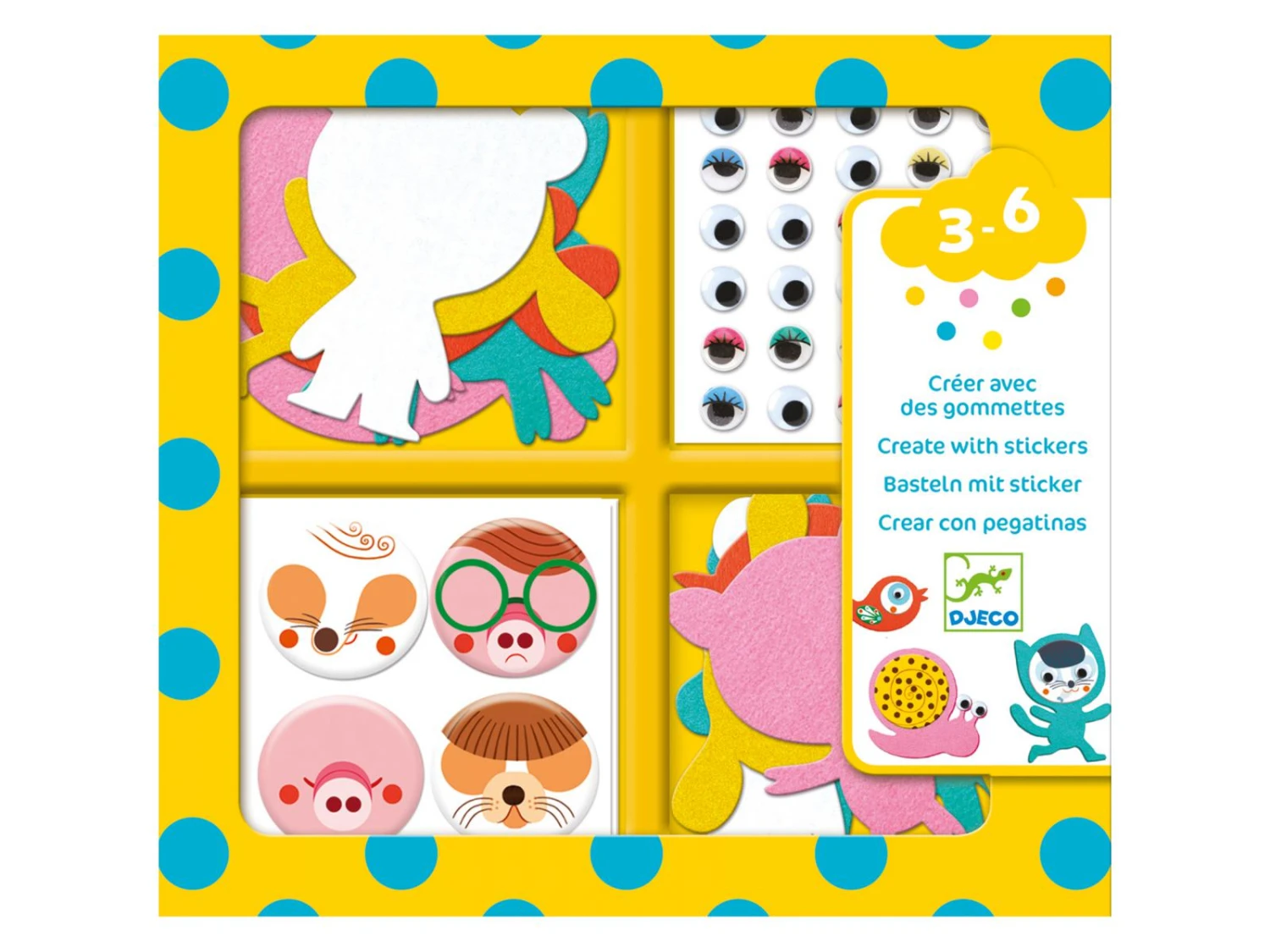 Une activité de collage pour créer de jolis animaux autocollants. L’enfant, choisit une silhouette d’un animal en feutrine et il la décore librement avec les gommettes en volume et les yeux mobiles. Les animaux prennent vie, il ne reste plus qu’à les coller.