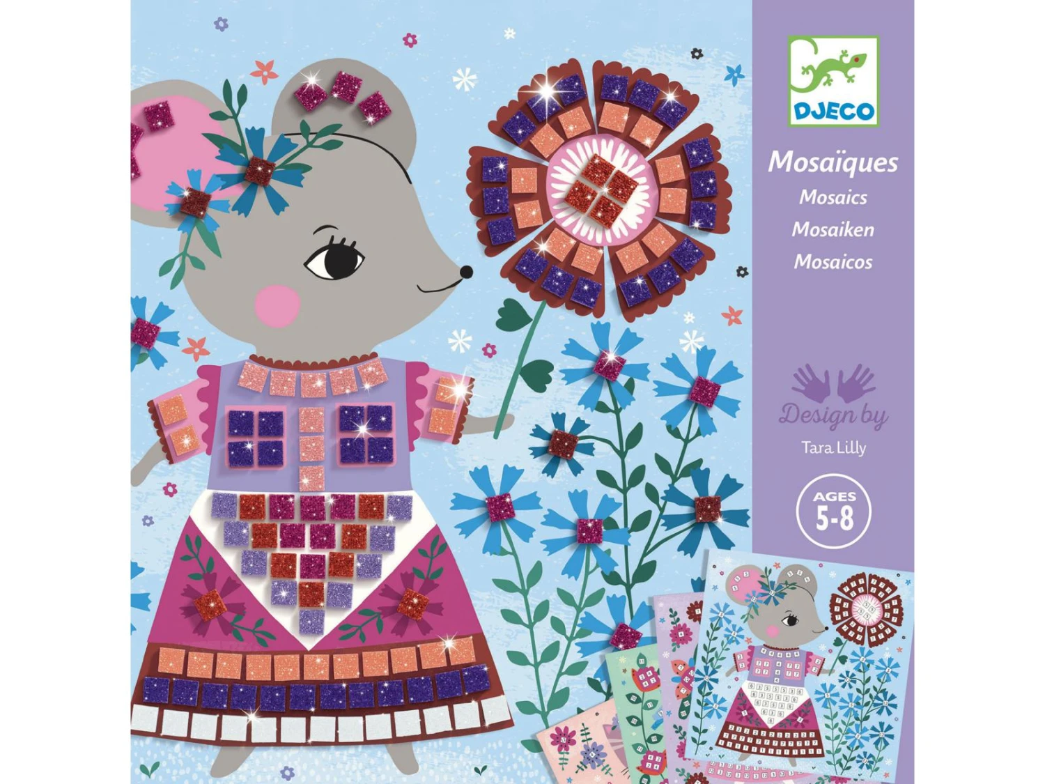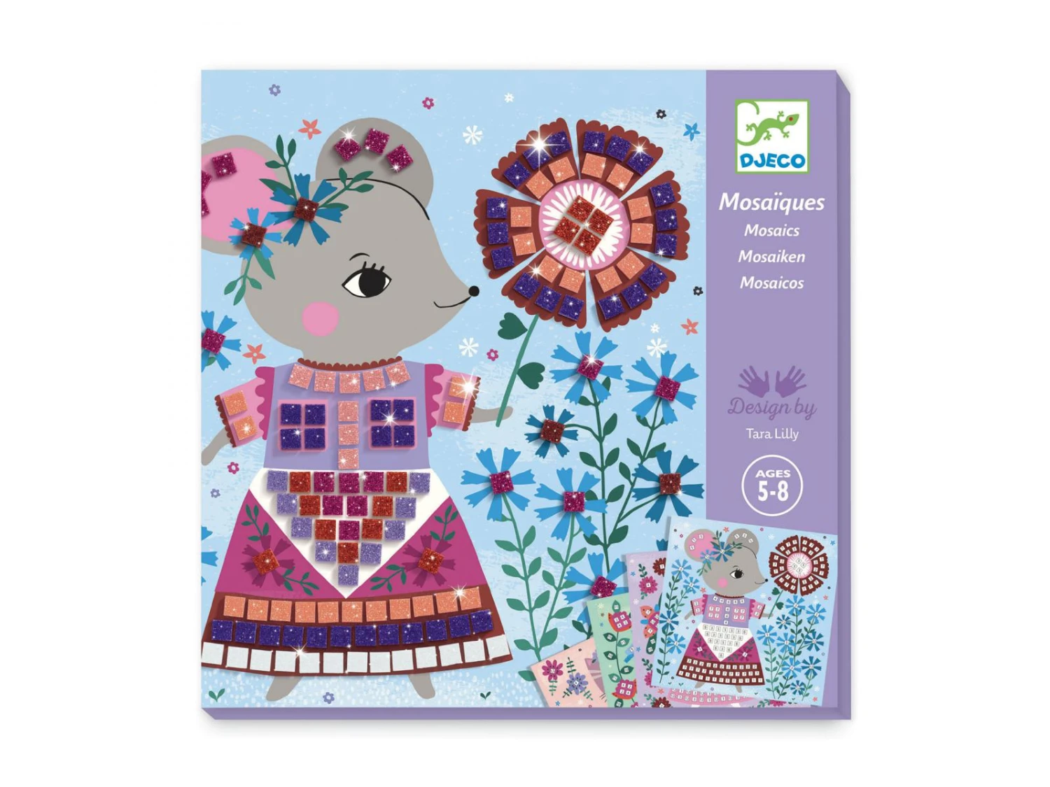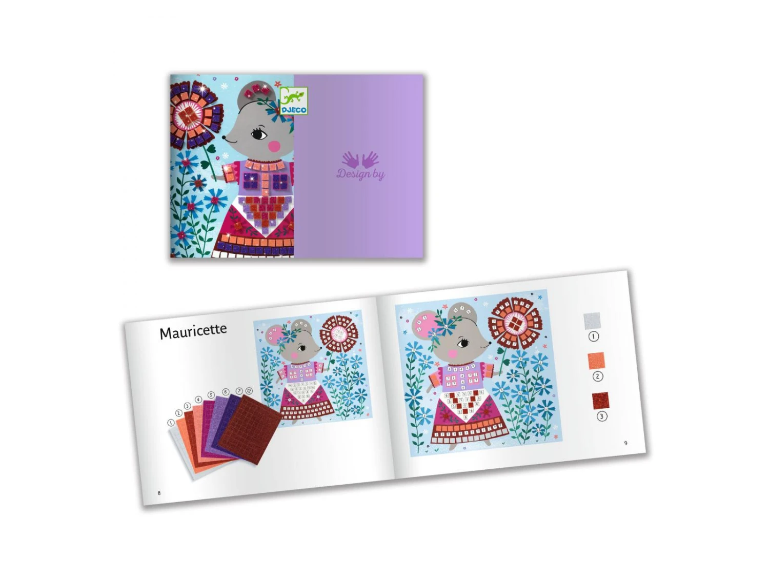 Un coffret pour s’initier à l’art de la mosaïque en décorant les tenues de ces adorables personnages. 4 tableaux à compléter avec de petits carrés de mousse pailletée qui s’utilisent comme des stickers. L’enfant repère les numéros puis colle les pièces correspondantes à l’emplacement désigné sur la planche. Les tableaux se remplissent et les personnages prennent vie.
