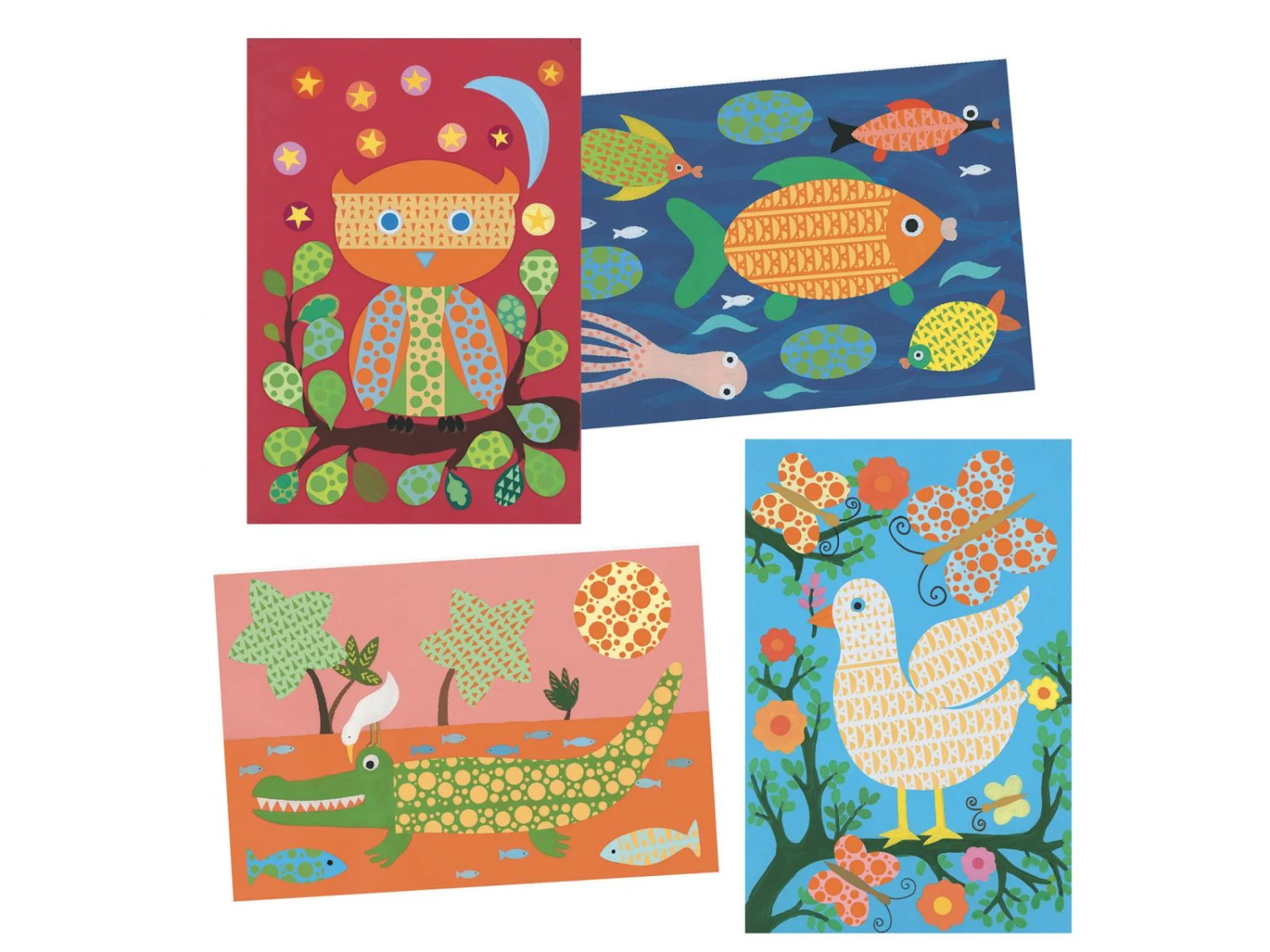 Un grand coffret de peinture sur le thème des animaux. Après avoir protégé la table avec la nappe, l’enfant colle le masking-tape dentelé sur les grandes cartes illustrées puis peint par dessus. Une fois la peinture sèche, il retire le masking-tape et découvre de jolis motifs. Magique !