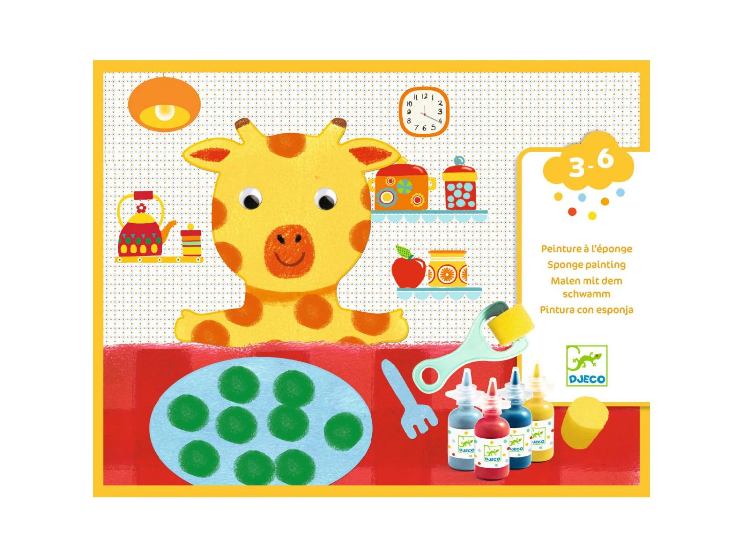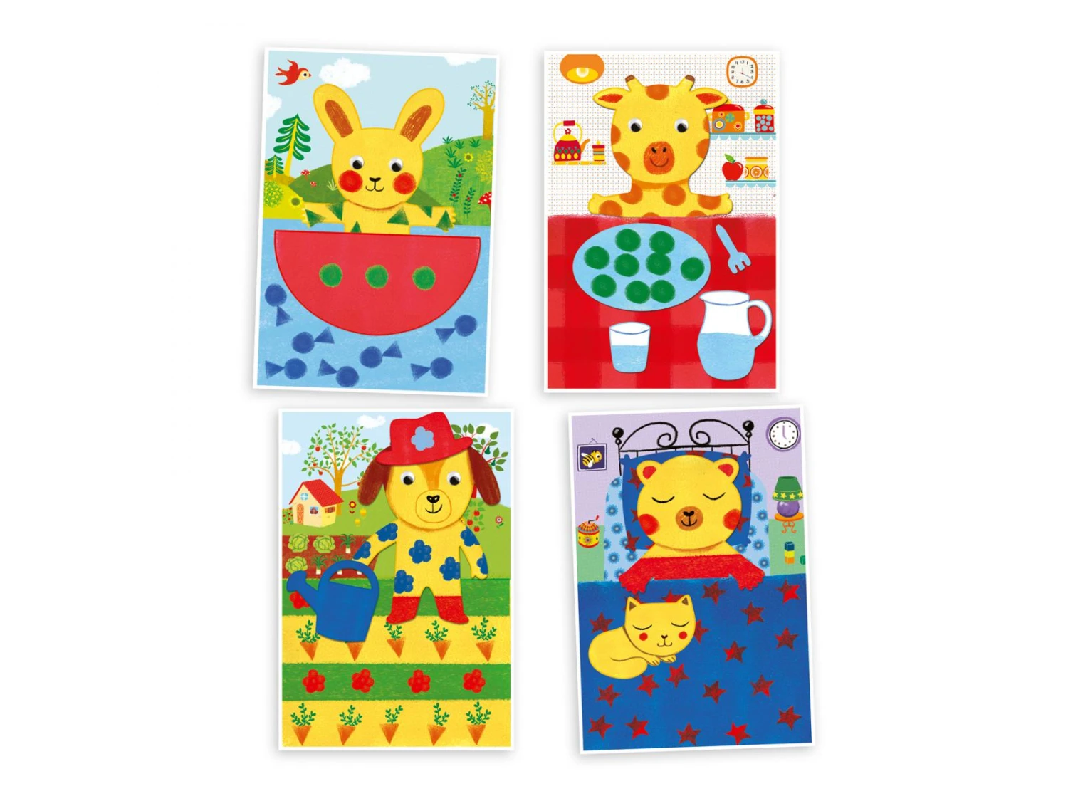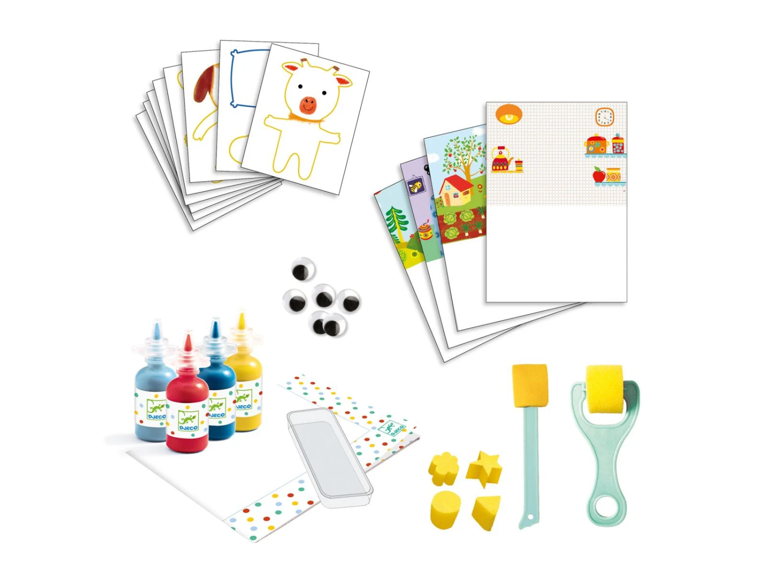 Un grand coffret de peinture sur le thème des animaux. Après avoir protégé la table avec la nappe, l’enfant peint toutes les pièces en utilisant le pinceau, les rouleaux et les éponges. Une fois les pièces sèches, il décore les 4 grandes cartes illustrées.
