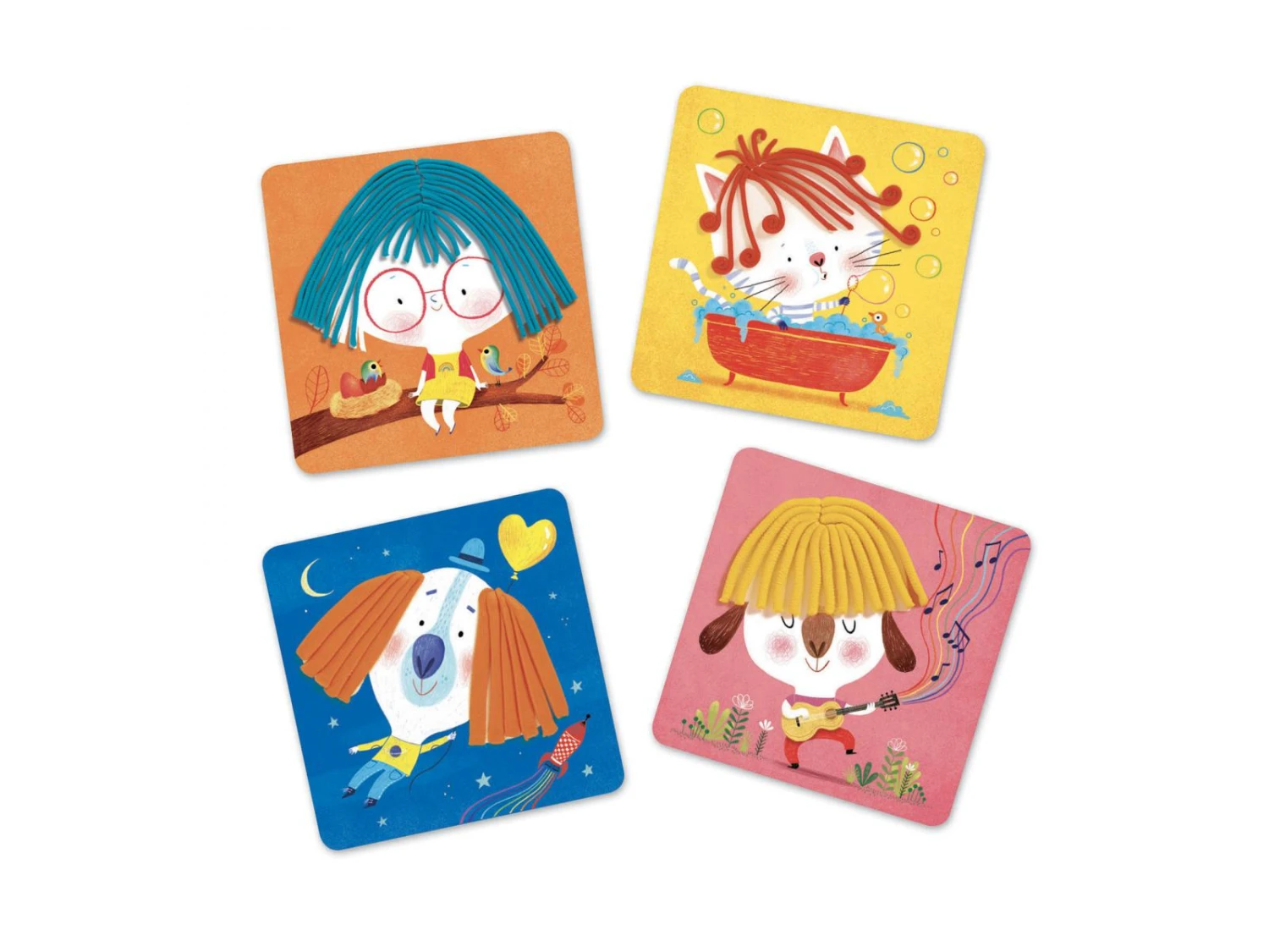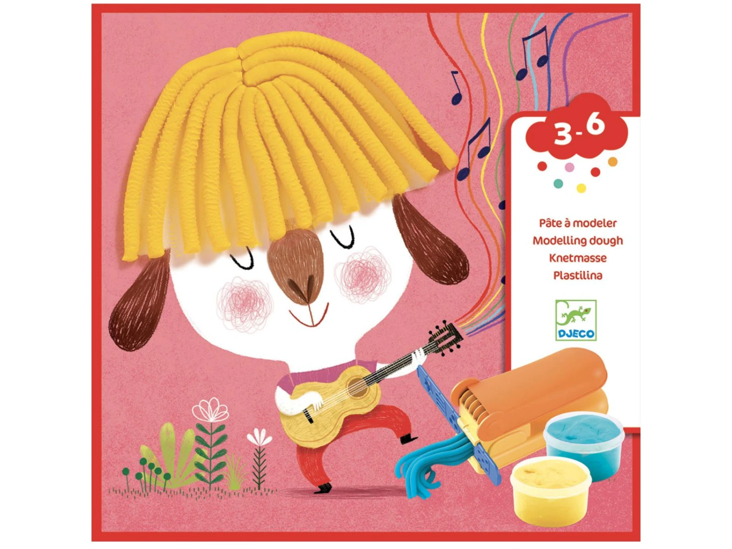 Une machine et 2 barrettes pour faire des cheveux rigolos, une roulette pour les couper. 4 planches illustrées, utilisables à l’infini et bien sûr, 4 pots de pâte à modeler.