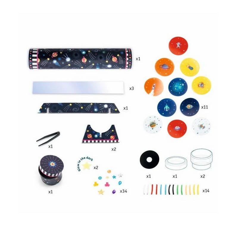 Le coffret comprend tout le nécessaire pour réaliser le kaléidoscope avec une boite de rangement pour les accessoires et un socle pour le kaléidoscope afin de tout ranger une fois l’activité terminée.
