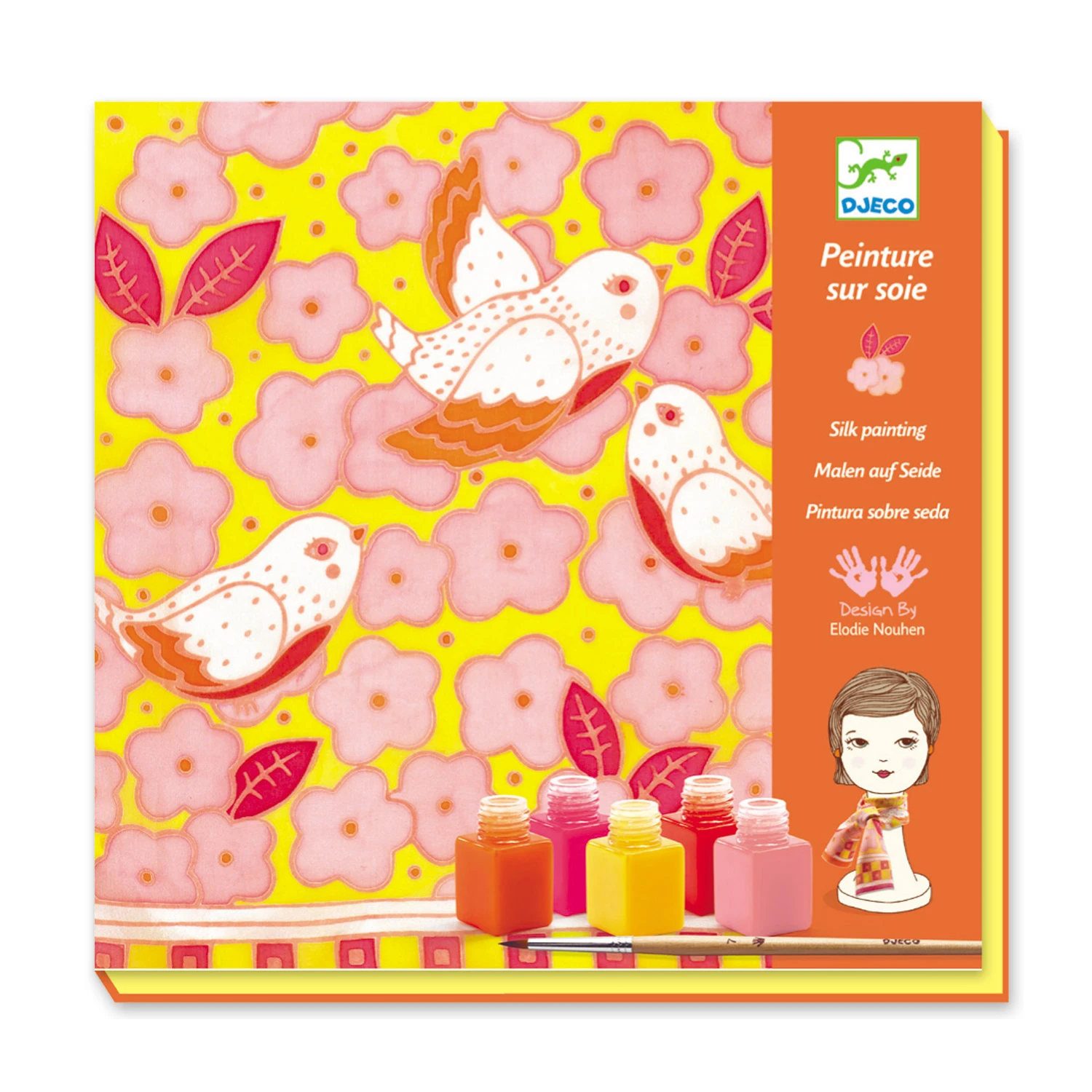 Petits artistes en piste ! La boîte ouverte devient un cadre sur lequel vous pouvez tendre l’écharpe en pure soie, à l’aide d’épingles. Puis, suis les tracés pour créer le foulard de vos mains. Magique ! Les tracés arrêtent la diffusion des encres. Une fois le foulard mis en couleur, fixe les encres avec un sèche-cheveu pendant 10 minutes environ. Après un rapide lavage à la main pour vérifier que les encres sont bien fixées, le foulard pourra passer à la machine à 40°.