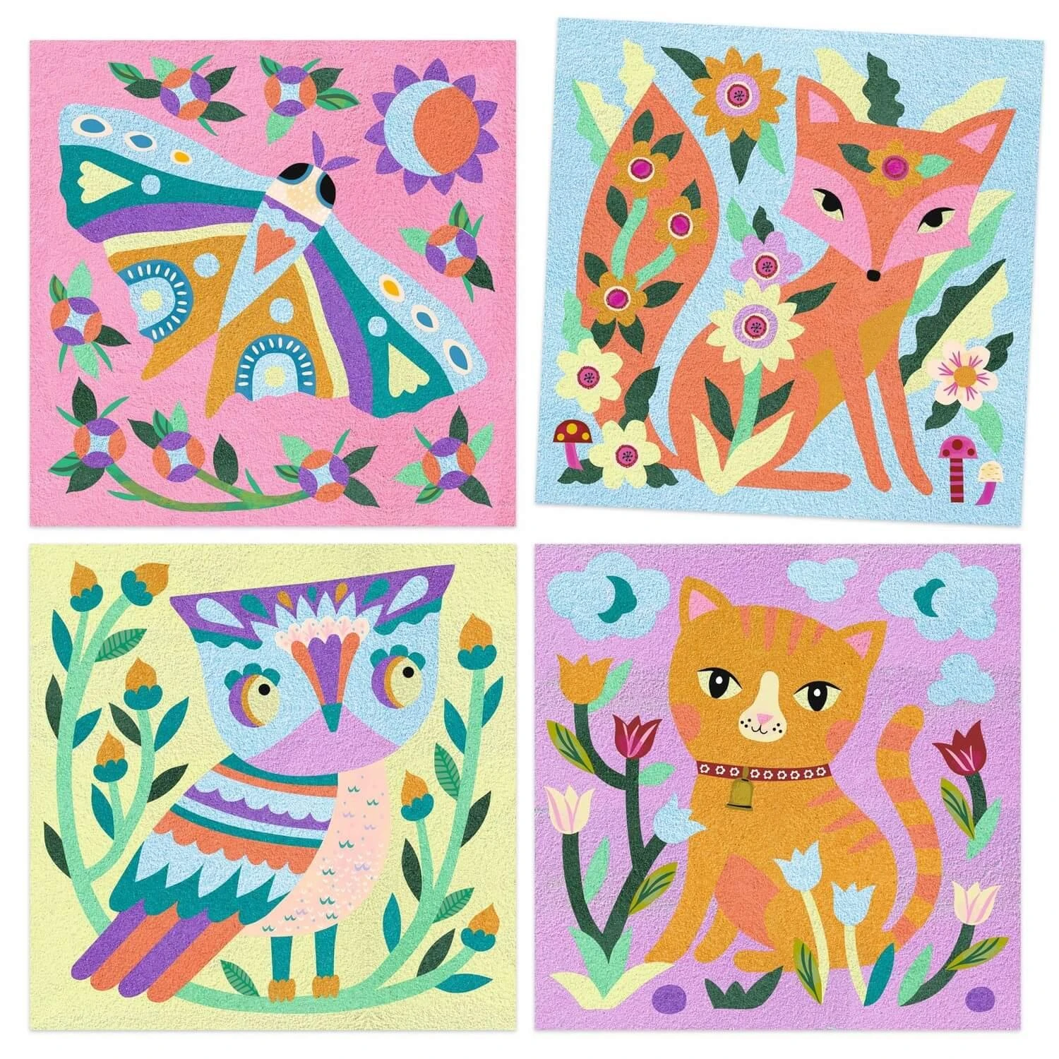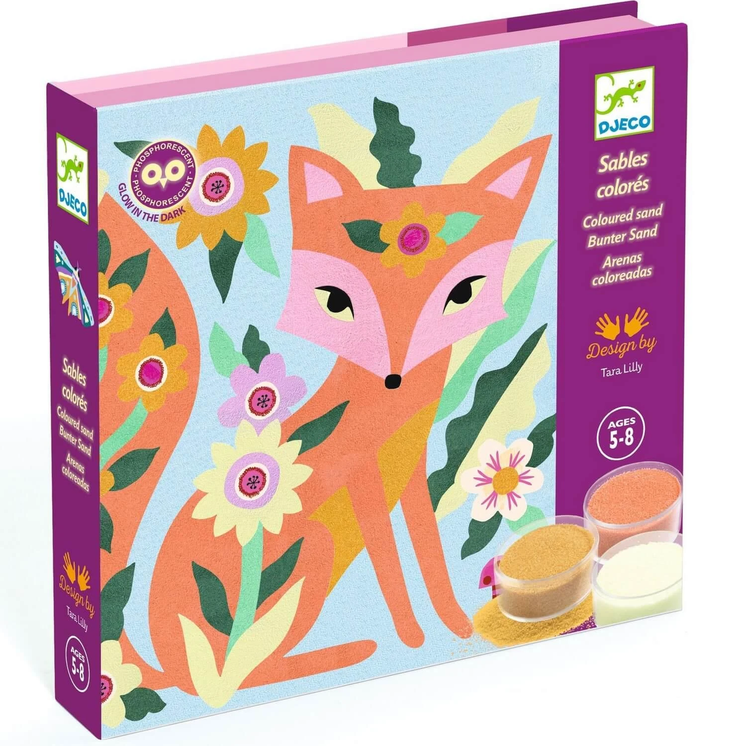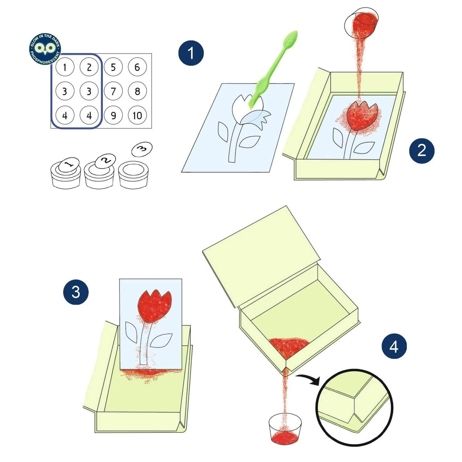 4 tableaux présentant des animaux nocturnes à mettre en couleurs avec des sables colorés et phosphorescents. L’enfant place son tableau dans la boîte, il dévoile les zones préencollées grâce à l’outil fourni puis les saupoudre de sable en suivant le code couleurs indiqué dans le livret. Une fois les tableaux exposés, quelle surprise à la nuit tombée : les illustrations se révèlent dans le noir ! Grâce aux sables phosphorescents, les animaux se voient dans le noir ! Un outil astucieux créé par Djeco pour décoller facilement les parties encollées. C’est une activité propre, l’enfant travaille dans la boîte pour éviter d’éparpiller le sable. Ce kit astucieux possède une boîte avec un petit trou pour récupérer le surplus de sable et le verser dans les pots à large ouverture. Il y a également une boîte de rangement avec une fermeture élastique pour stocker son matériel une fois l’activité terminée.