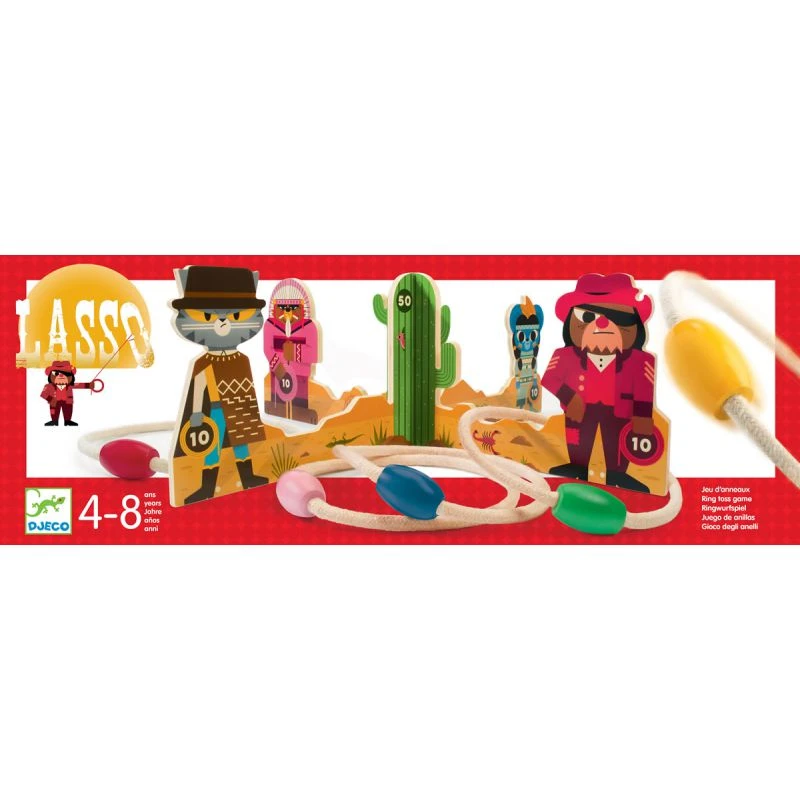 Lasso de Djeco est un jeu de lancer d’anneaux avec lequel les enfants vont pouvoir tester leur adresse. Ce jeu classique vous est proposé par Djeco joliment illustré sur le thème des cow-boys et du far west. A tour de rôle chaque petit cow boy devra lancer les 5 anneaux et tenter de les placer autour des cibles afin de marquer des points.